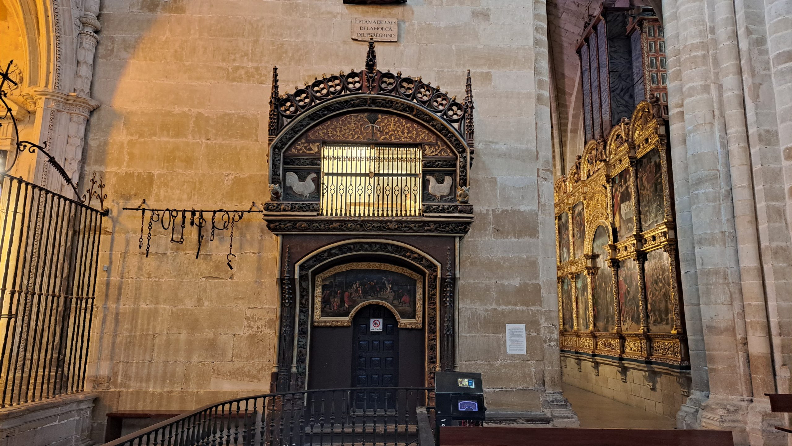 Santo Domingo de la Calzada zog sich und es war wieder mal nur Asphalt unter unseren Füßen, diese fingen schon an zu brennen. Endlich fanden wir die Straße, in der unsere Pension lag. Wir haben vom Inhaber 3 Codes zugesandt bekommen, einen für die Eingangstür, einen für die Wohnungstür und der dritte war für die Zimmertür. Nach der Dusche ging es unseren Füßen wieder besser. Wir zogen uns um und gingen in den Ort, wir hatten Hunger. Aber zuerst wollten wir in die Kirche, den Hahn und das Huhn sehen. Hoffentlich kräht der Hahn, das soll Glück bringen. Wir zahlten die 5 € pro Person Eintritt und schauten uns die Kirche an, die Tiere waren in einem Käfig, aber der Hahn krähte nicht.