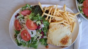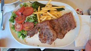 Einen Stempel bekamen wir auch für unseren Pilgerpass. Nun suchten wir uns eine Bar und wollten etwas zu Essen bestellen. Man sagte uns, dass es Essen noch nicht gab, erst ab 18 Uhr. Die ersten Getränke kamen schnell, dann kam ewig keiner mehr an unseren Tisch. Wir zahlten und gingen in eine andere Bar, die Gran Ferreteria Braseria. Hier bekamen wir unser Pilgermenü.