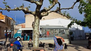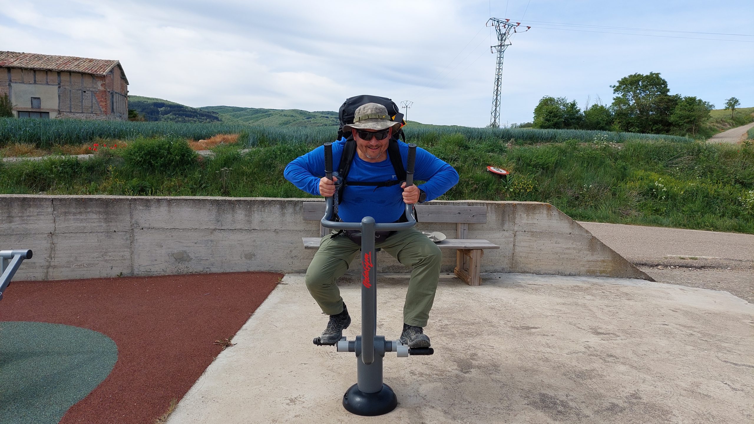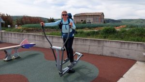 Auf dem Plaza de Mayor machten wir eine Pause, Schuhe aus und wir genossen unseren Apfel. Weiter ging es an der Straße, wir machten unsere Kopfhörer rein, denn der Straßenlärm war nicht so schön. Nach einigen Kilometern machten wir noch eine Pause. Wir setzten uns zu 2 Koreanerinnen in den Schatten. Sie teilten ihre Orange mit uns und wir gaben ihnen von unseren Nüssen ab. Süß die beiden. Nach der Pause liefen wir weiter, mit Musik auf den Ohren lief es sich leichter. Trotzdem schien der Weg endlos zu sein. Am Ende des nächsten Ortes war ein Spielplatz mit Trimm-dich-Pfad. Wir machten Quatsch und machten, gleich mit Rucksack auf dem Rücken, etwas Sport.