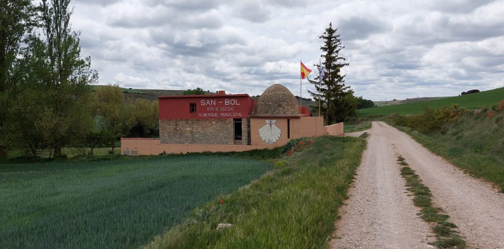 San Bol war in Sichtweite und ein Auto fuhr in seine Richtung. Es war die Hospitalera. Als wir angekommen sind, haben wir eingecheckt. Da es hier kaum Netz ging und die Personalausweise gescannt und hochgeladen werden mussten, dauerte dies. Wir zahlten die Betten, je 10 € und das Abendessen, je 12 €.