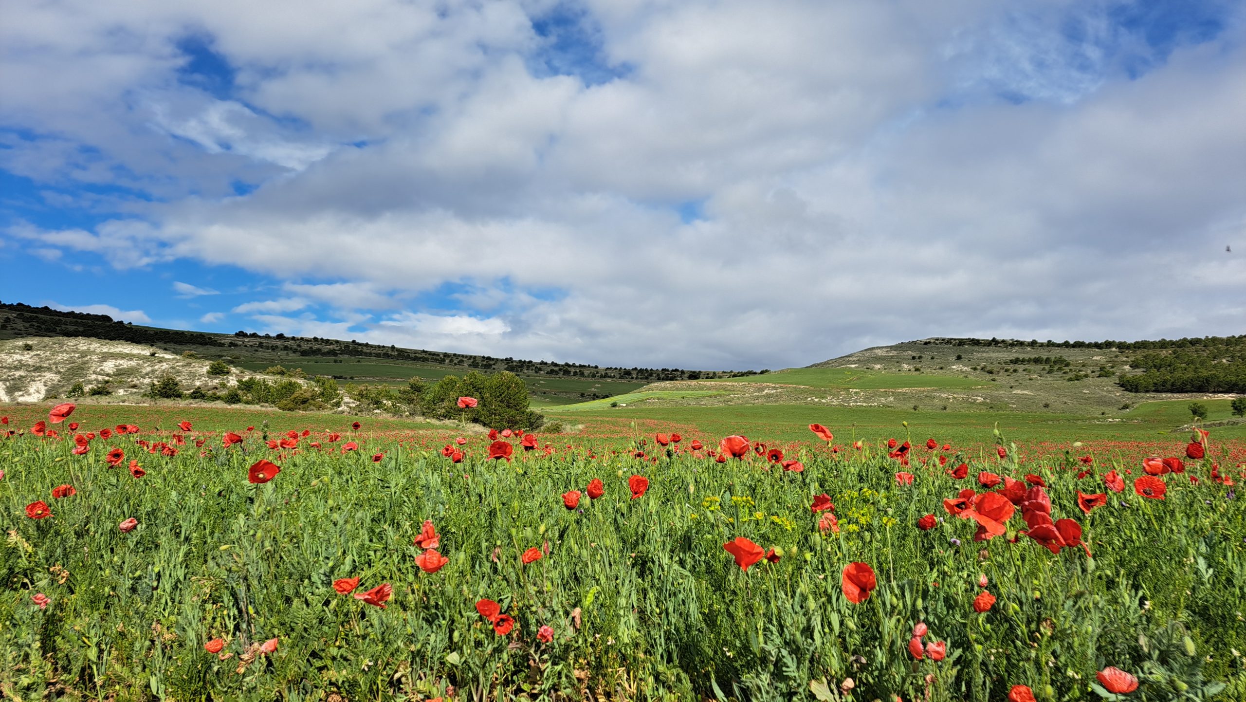 Wir trafen fast alle wieder, die auch in San Bol übernachtet hatten. Hontanas war auch ein schöner Ort, nun ging der Weg über Schotter weiter, vorbei an Mohnfelder. Nico sein Schienbein war heute viel besser, an Abbruch war nicht mehr zu denke, dank Voltaren und Bandage.