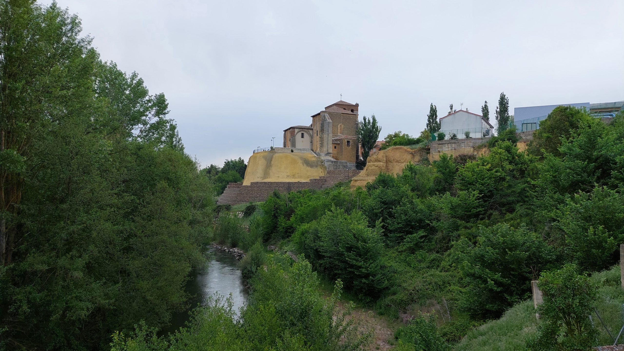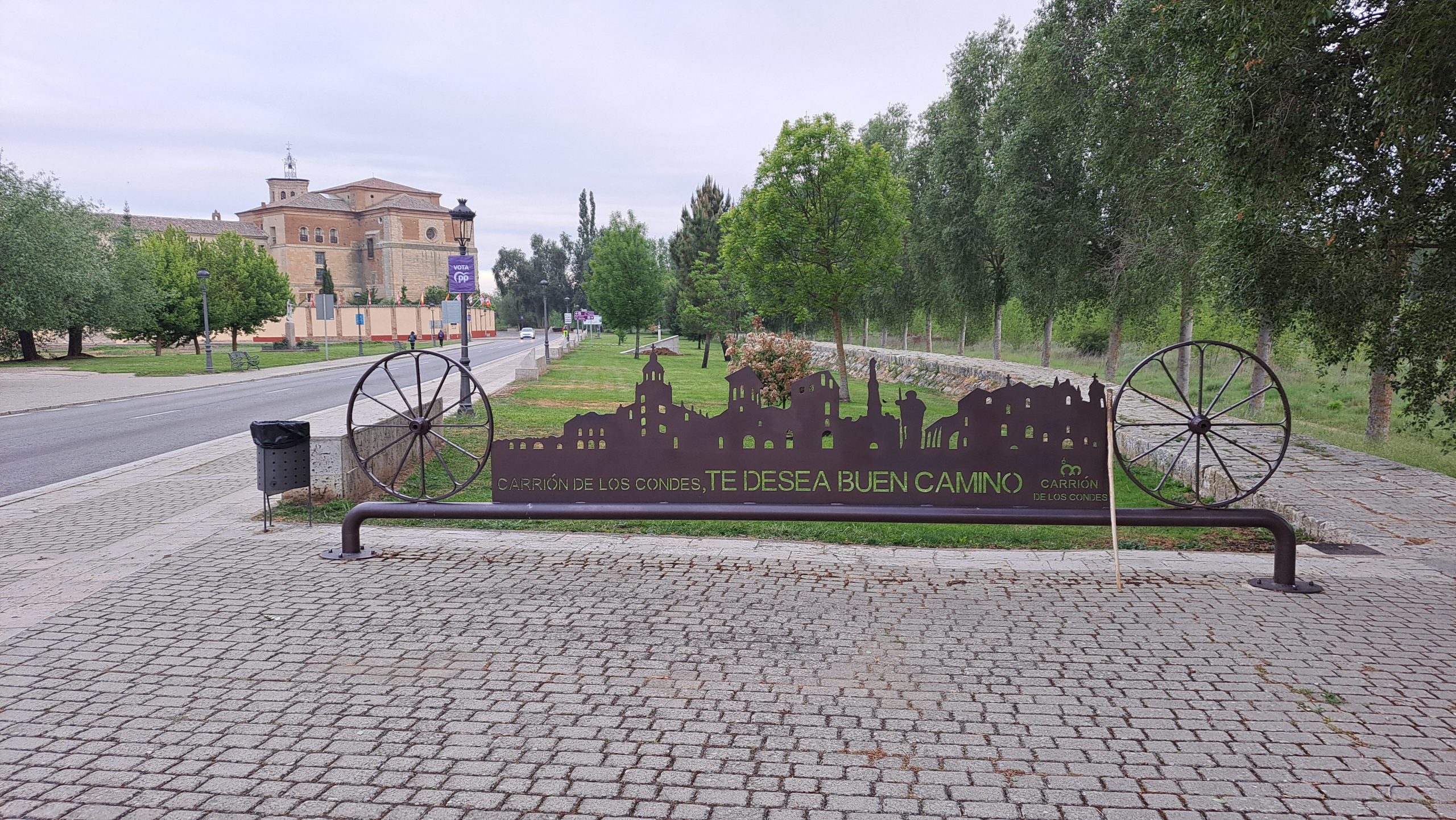 Nach dem Wach werden, packten wir unsere Rucksäcke und verließen das Hostal. Wir schauten, ob wir irgendwo einen Kaffee bekamen. An der ersten Bar gingen wir vorbei, die war sehr voll. In der 2. Bar machten wir eine Kaffeepause. Auch die Guardia Civil frühstückte hier. Nun gingen wir über den Rio Carrión hinweg und an dem 4 Sterne Hotel vorbei, in dem Hape Kerkeling damals übernachtet hatte.
