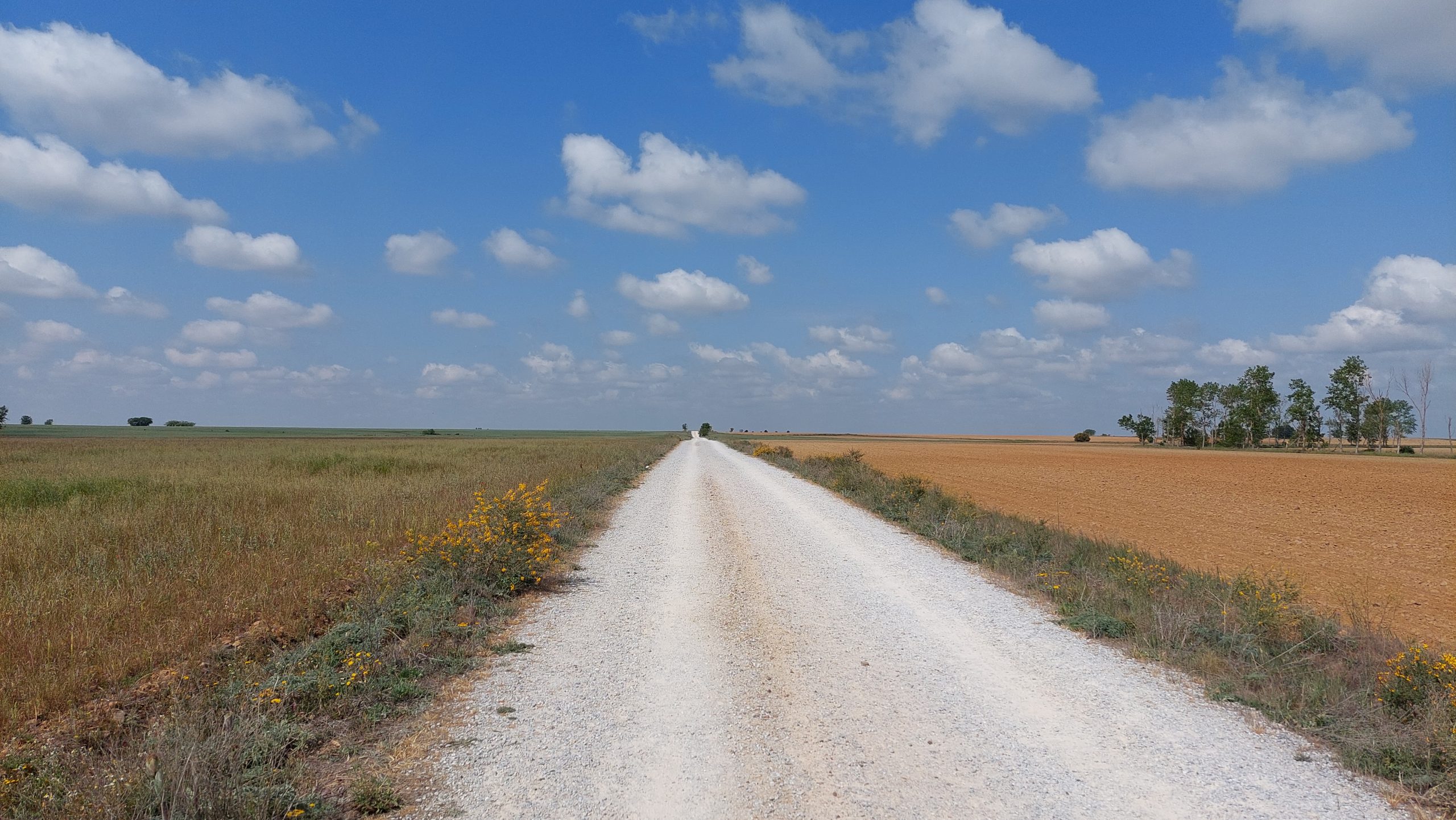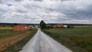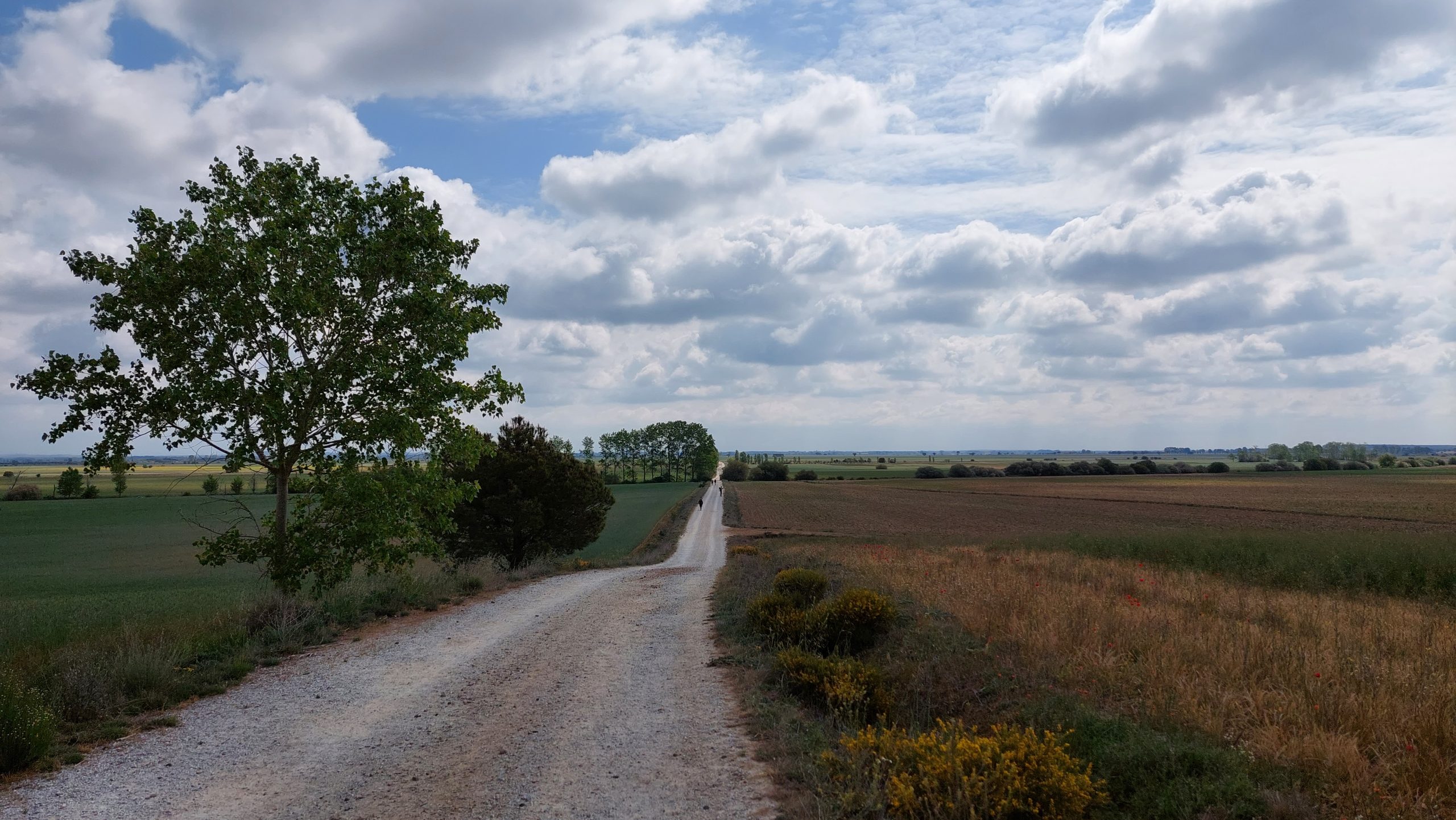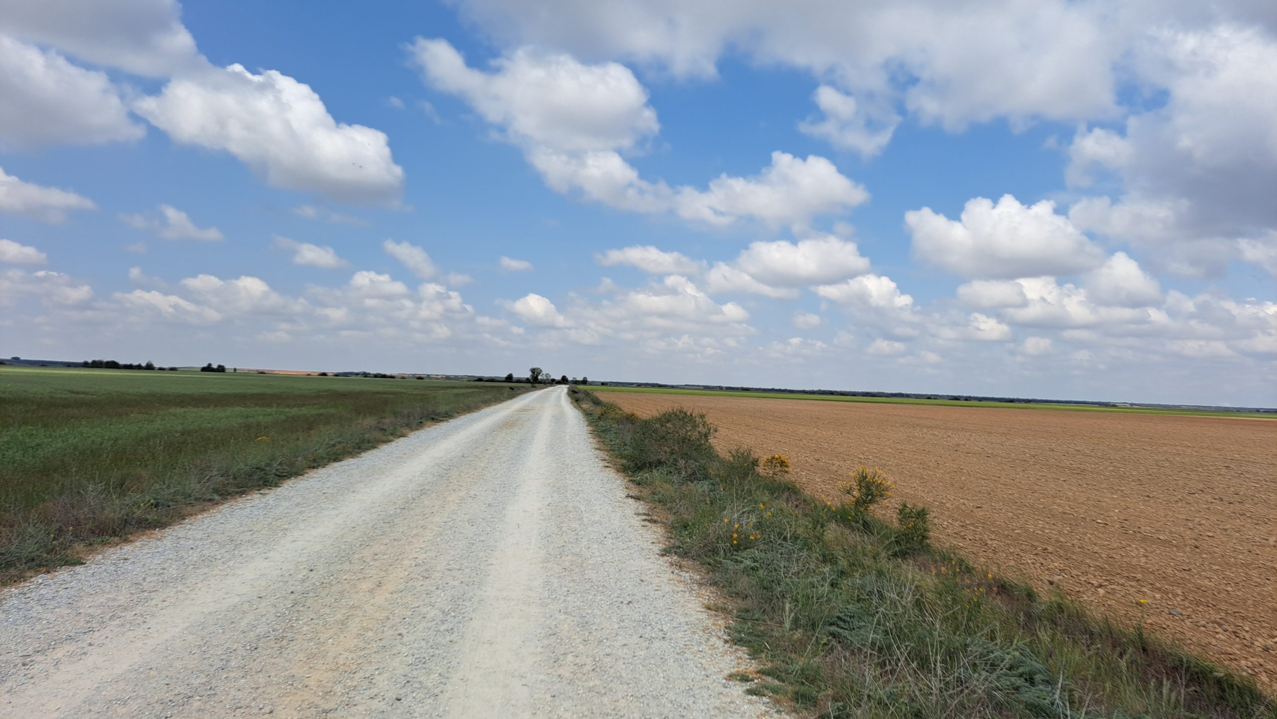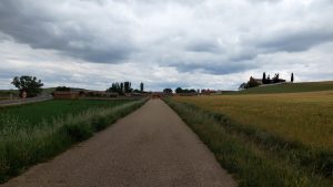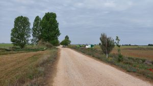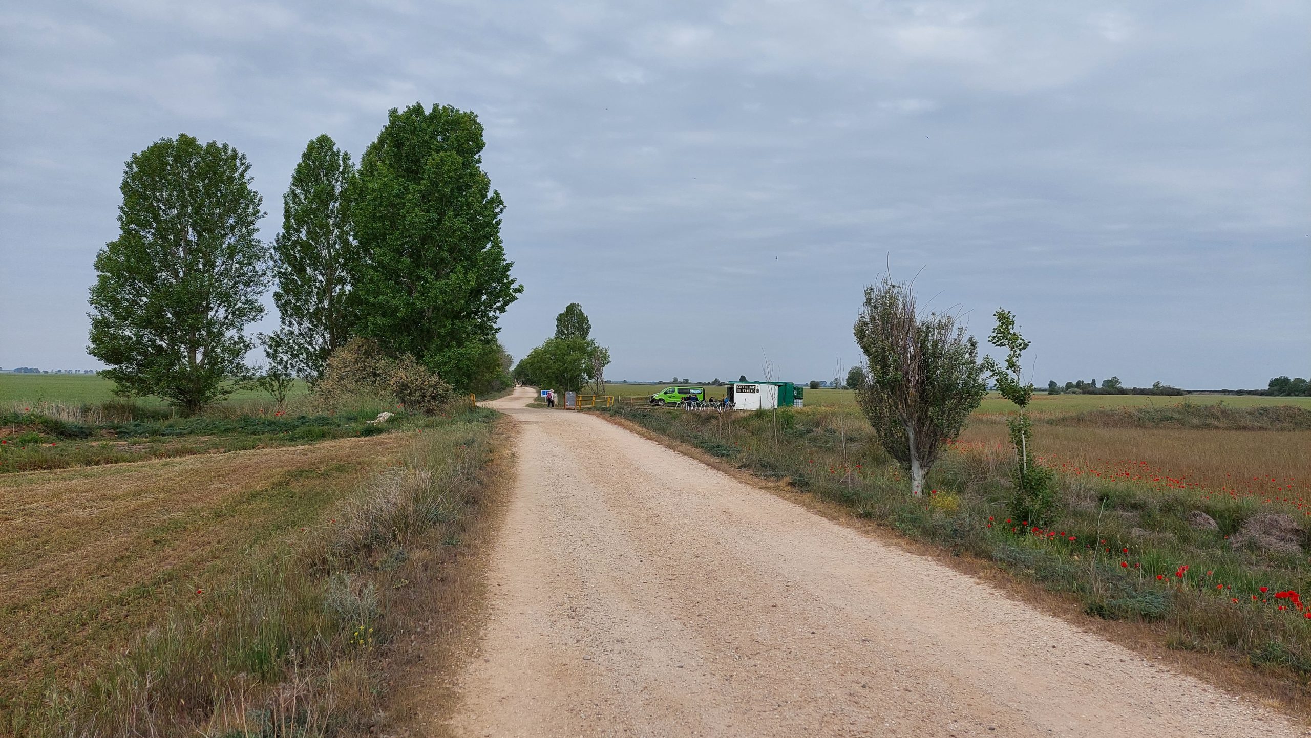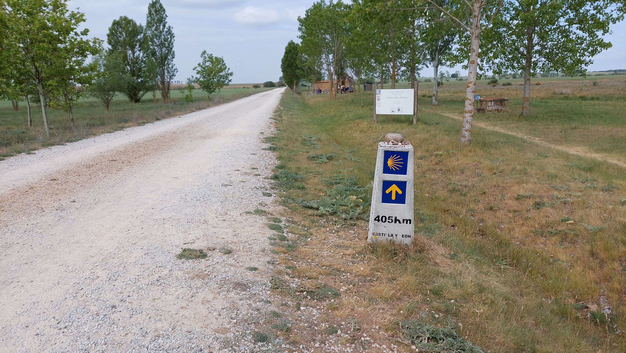 Hier im Nichts mit Notstromaggregat konnte man mit Kreditkarte zahlen, auch Kleinstbeträge, das ist in Deutschland kaum möglich. Leider gab es keine Toilette, also Banjo Frances und weiter ging es. Ca. 10 km kaum Abwechslung in der Landschaft, immer ein Schritt vor den anderen setzend gingen wir bis einem Pilgerrastplatz. Hier waren ein paar Tische mit Bänken aufgestellt, doch diese waren alle besetzt. Es hab noch 2 Holzplattformen, wir gingen zu einer und legten uns darauf und machten eine Pause. Eine junge Frau legte sich dann auch auf die zweite Plattform, nach ein paar Minuten fragt sie, ob wir Sonnencreme hätten. Eine kleine Flasche hatte ich mitgenommen, klar teilte ich. Man braucht ja nicht viel.