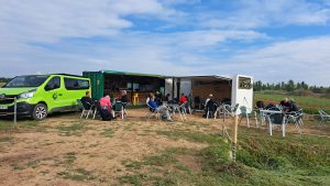 Nun liefen wir eine ganze Zeit direkt neben der Straße entlang. Nun bog der Camino auf die Felder ab. Heute war die Etappe, auf der 18 km nichts kommen sollte, kein Ort, keine Bar, kaum Bäume. Doch nach 6 km kam eine Oase, die Erfrischungen anbot. Wir bestellten Kaffee, Hot-Dog und Empanada zum Frühstück und bekamen jeder ein kleines Glas frisch gepressten Orangensaft dazu.