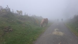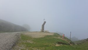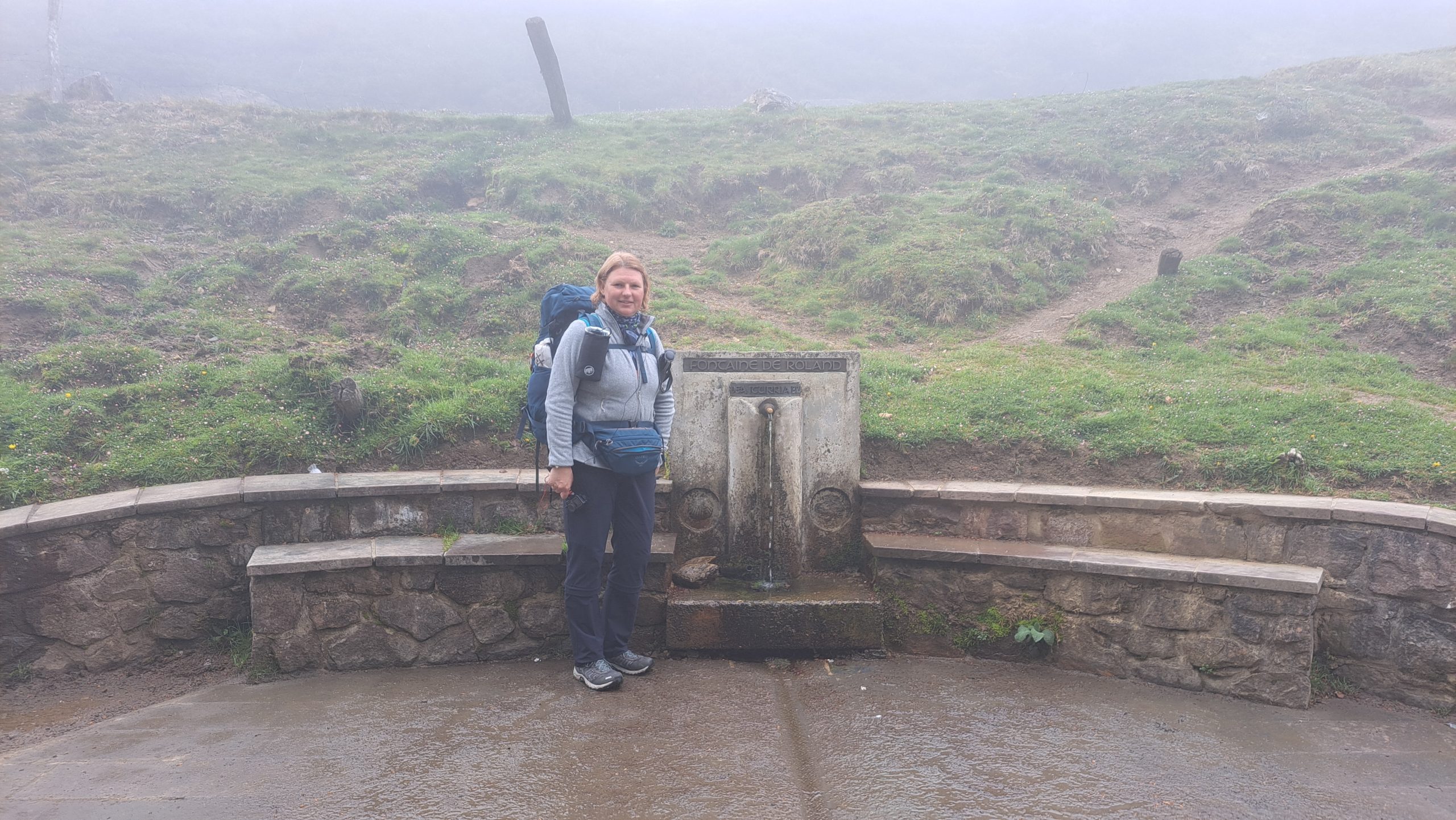 Einen Stempel gab es hier auch. Am Gipfelkreuz standen wieder Wildpferde, die auch mit auf das Foto wollten. Durch die Wolken und den Nebel haben wir die heilige Maria nicht gesehen. Es war stellenweise sehr dichter Nebel, wir mussten schon genau schauen, wo der Weg entlang ging. Dann kamen wir an der Rolandsquelle vorbei und füllten unsere Trinkflaschen mit frischem Quellwasser, wie erfrischend es war.