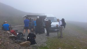 Wir liefen los, immer bergauf, an Wildpferden vorbei und durch die Wolken, wir kamen an einem Food Truck vorbei, wo wir uns einen Kaffee holten.