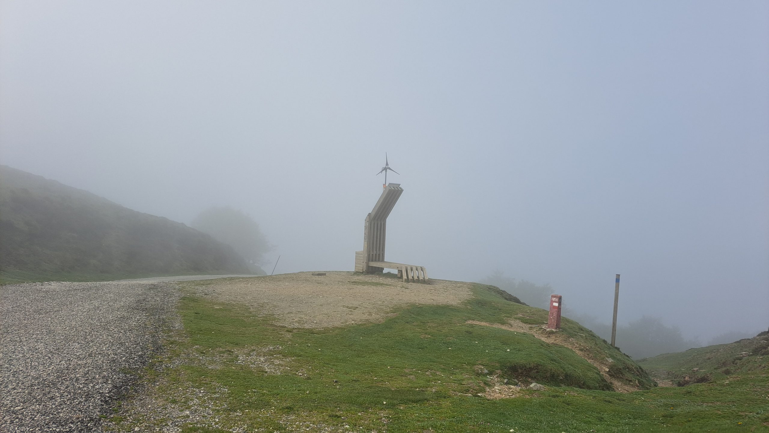 Wir hatten gestern Baguette in der Herberge vorbestellt und mitgenommen, hier gab es ein Stück. Nun überquerten wir die Grenze und waren in Spanien. An der Schutzhütte angekommen, trafen wir Jutta und Jürgen wieder. Mit dem Rest Baguette auf der Faust gingen wir weiter. Wir wurden von jemanden eingeholt und gingen mit ihm ein Stück. Es stellte sich heraus, dass er auch aus Deutschland kam, genauer aus Würzburg und er ging schon zum 10. Mal den Camino. Er hatte einen Wickelroch an und Wanderschuhe und schwarz lackierte Fingernägel. Er war mit einem leichten Rucksack ausgerüstet und hatte seine Gitarre bei. Wir erzählten über alles Mögliche, nur nach dem Namen fragte keiner, so gaben wir ihm den Namen Gitarrenmann. An der Notrufsäule mit Bank machten wir eine Pause. Er verabschiedete sich und ging weiter, denn er hatte heute noch einen weiteren Weg als wir. Er hatte vor täglich 40 km zu wandern, denn er hatte nur 4 Wochen Zeit.