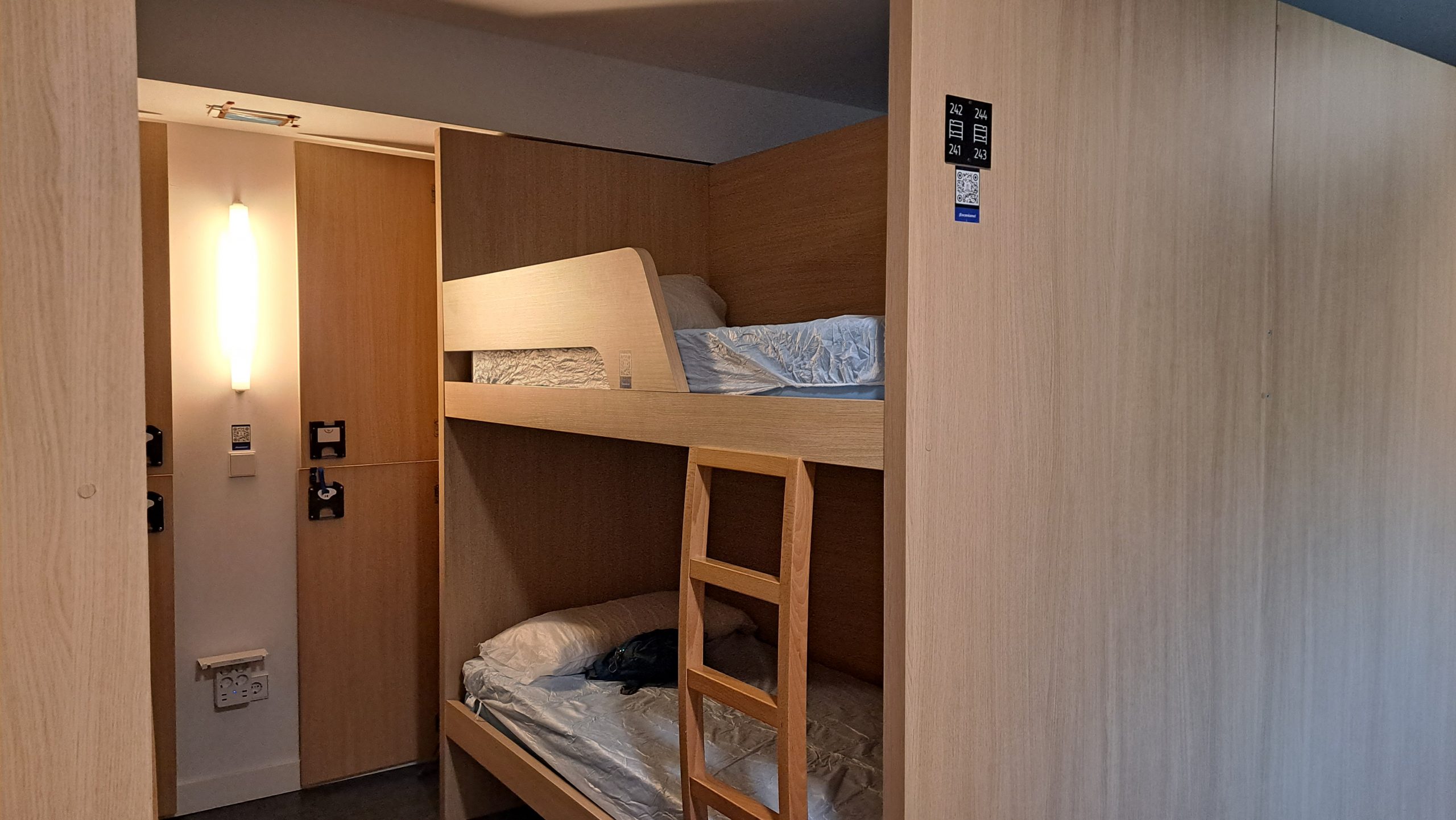 Anmelden konnte man sich schon, aber in die Etagen kam man noch nicht. Wir stellten uns in die Schlange und warteten, bestimmt eine Stunde, als wir angemeldet waren, konnte man auch in die Etagen, wo die Betten waren. Vorher musste man seine Schuhe in den vorgesehenen Raum stellen, der schon sehr nach Fuß roch. Nur schnell rein und wieder raus. Wir waren eine der Ersten, die in dieser Etage waren. Also unsere Bettnummer gesucht, die Betten mit Papierbettwäsche bezogen und gleich unter die Dusche, diese waren noch schön sauber.