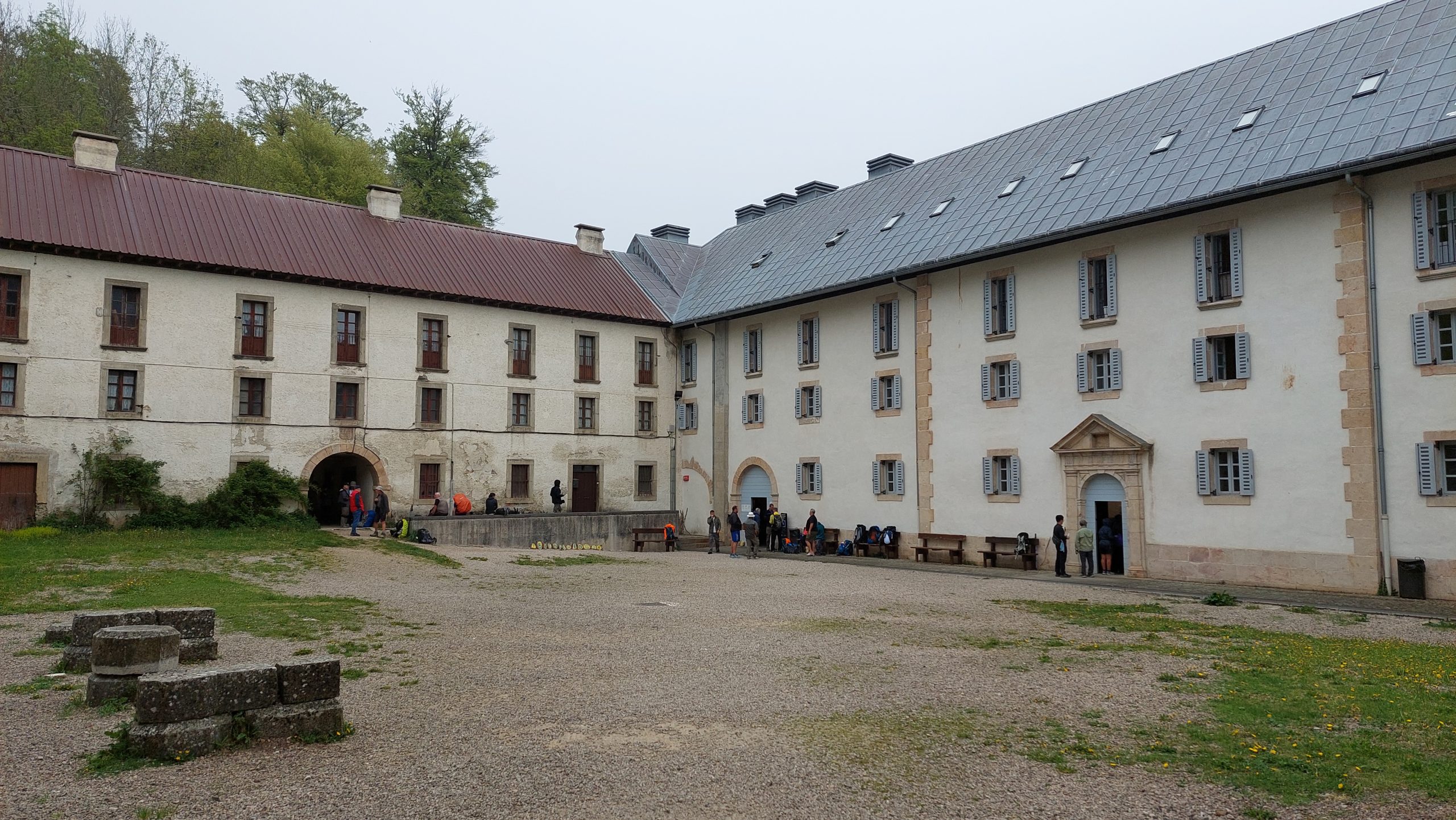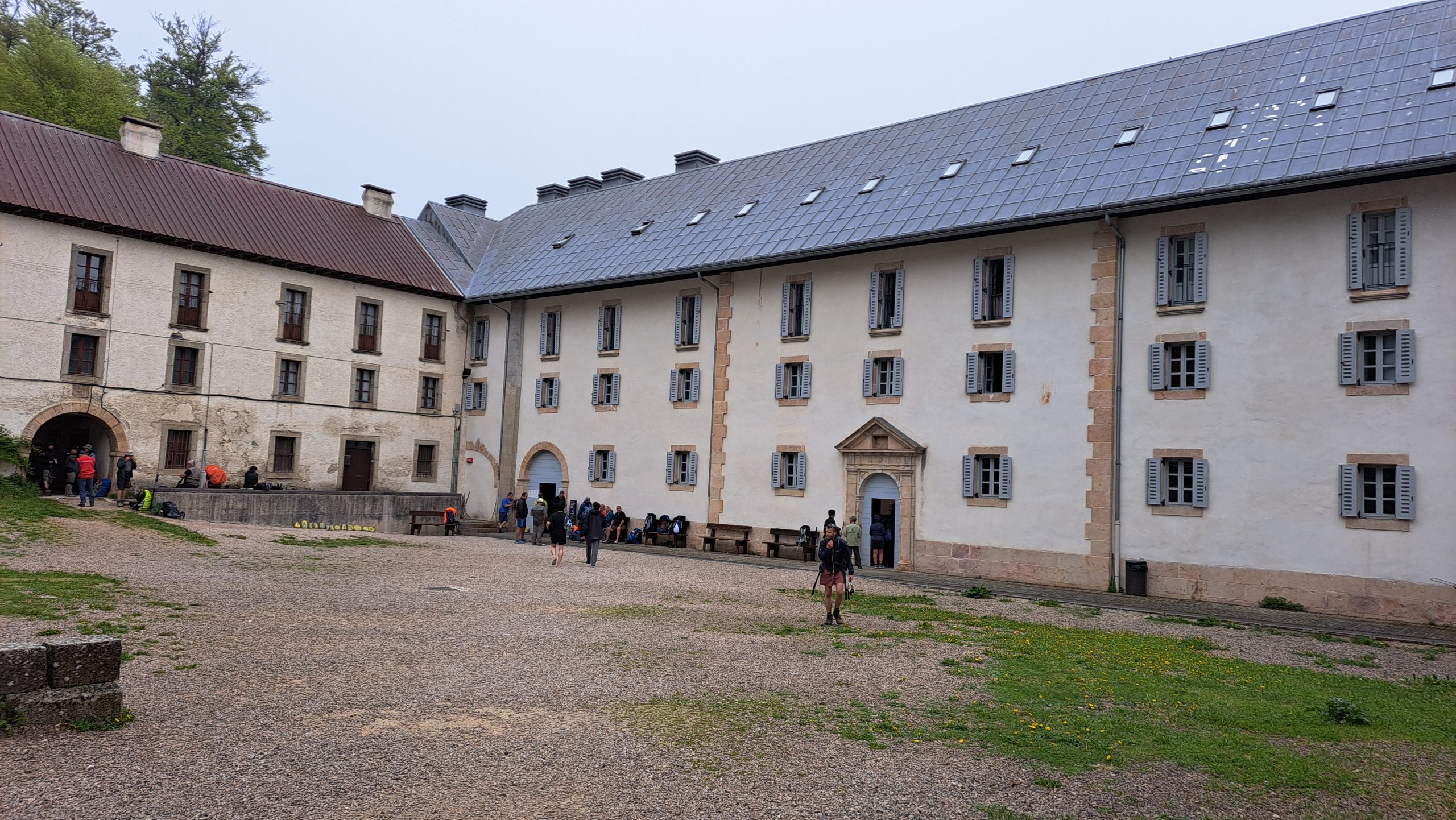 Rechts neben der Notrufsäule ging der Weg dann weiter und das steil bergab. Ca. 100m weiter teilte sich der Weg in einen steilen Teil 3,6 km und den moderaten Abstieg mit 4,2km. Nico wollte den steilen Abstieg versuchen. Uns kam er allerdings so vor, wie die Wege im Harz, also nicht so schwierig. In Roncesvalles angekommen gingen wir gleich zum Kloster, in dem wir heute unser Bett reserviert haben.