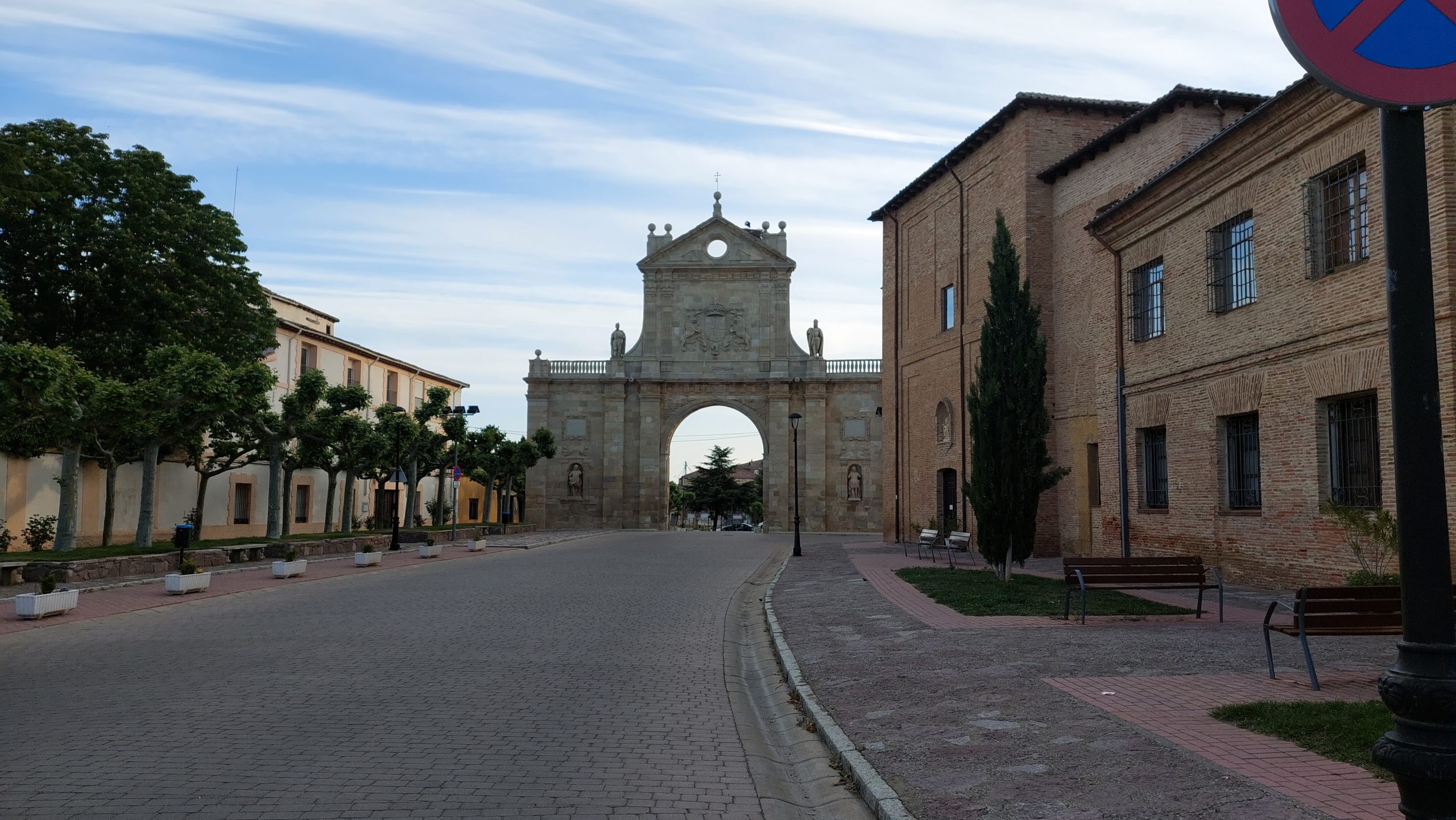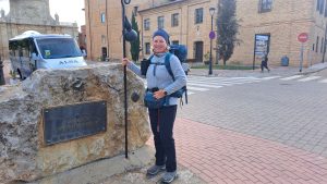 Wir liefen gegen 7:45 Uhr in Sahagún los. Der Camino führte fast an unserer Ferienwohnung vorbei. Die erste Bar war unsere und wir frühstückten sehr lecker. Dem Weg folgend kamen wir am Arco de San Benito vorbei. Hier machten wir Fotos, auch ein bronzener Pilgerstab und Schuhabdrücke. Mit dem Pilgerstab sahen wie echte Pilger aus.