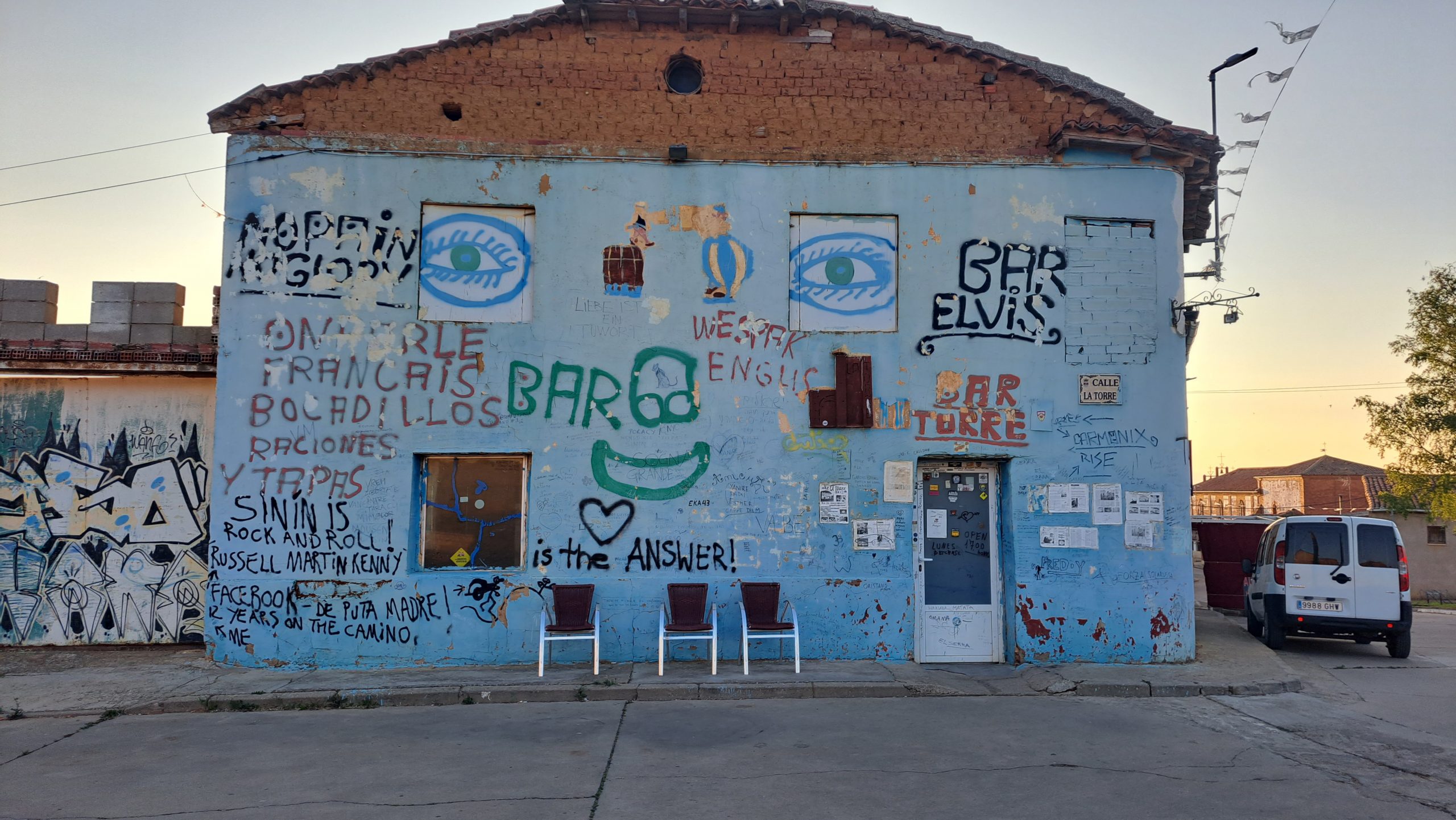 Sie kam direkt aus der Elvis-Bar und hatte schon einige (6) Sangria getrunken. Elvis machte die Sangria nach Belieben, sie war ganz schön angetrunken und quatschte alle nieder. Wenn andere zu Wort kamen, unterhielten wir uns ganz gut. Nach dem Essen wollten wir auch die Elvis-Bar besuchen, um den Typ hinter der Bar zu sehen, der diese Bar legendär machte. Die Bude war ganz schön verräuchert und es roch nach Marihuana. Wir bestellten 2 Cortado und bekamen 2 Cola, naja. Wir zahlten und gingen dann in die Herberge zurück, diese war ja gleich um die Ecke. Nach dem anstrengenden Tag schliefen wir schnell ein.