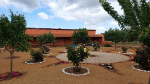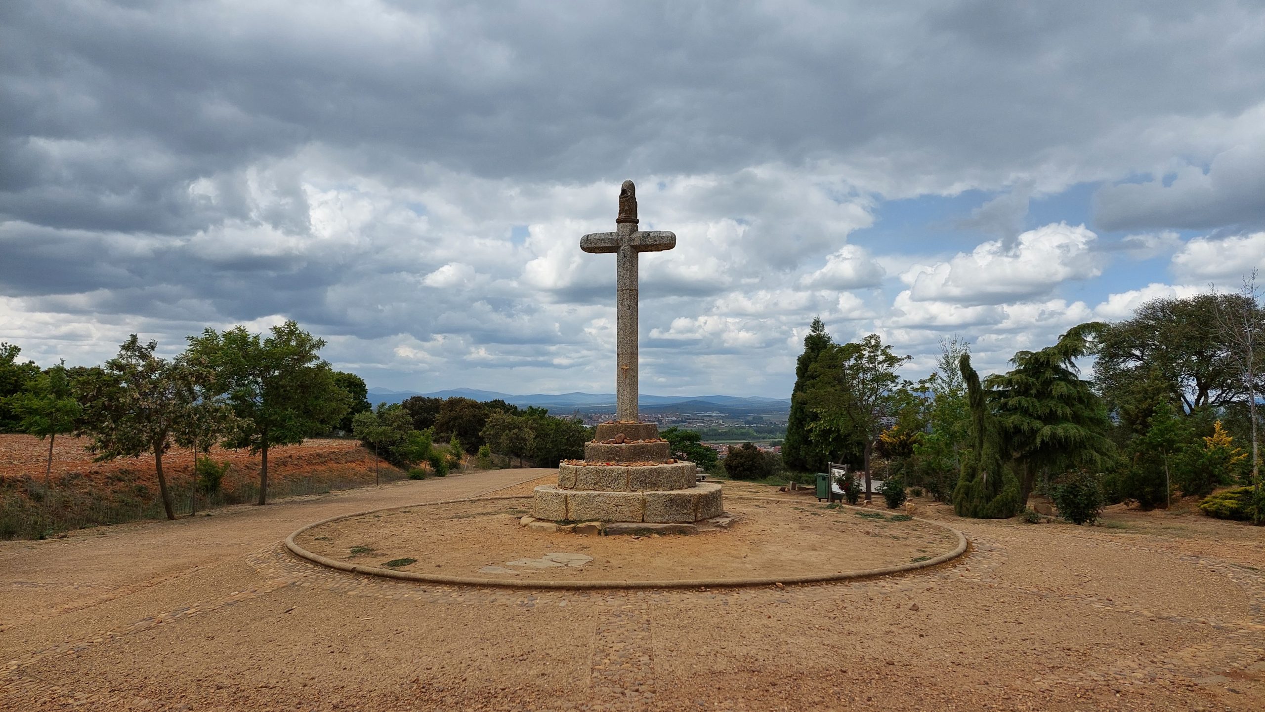 Wir liefen den Weg weiter an einem Kreuz vorbei. An einem Trinkbrunnen mit Pilgerstatue machten wir eine Pause. Wenn man den Brunnen anmacht und den Wasserhahn zuhält, läuft das Wasser in die Kalebasse des Pilgers und er trinkt.