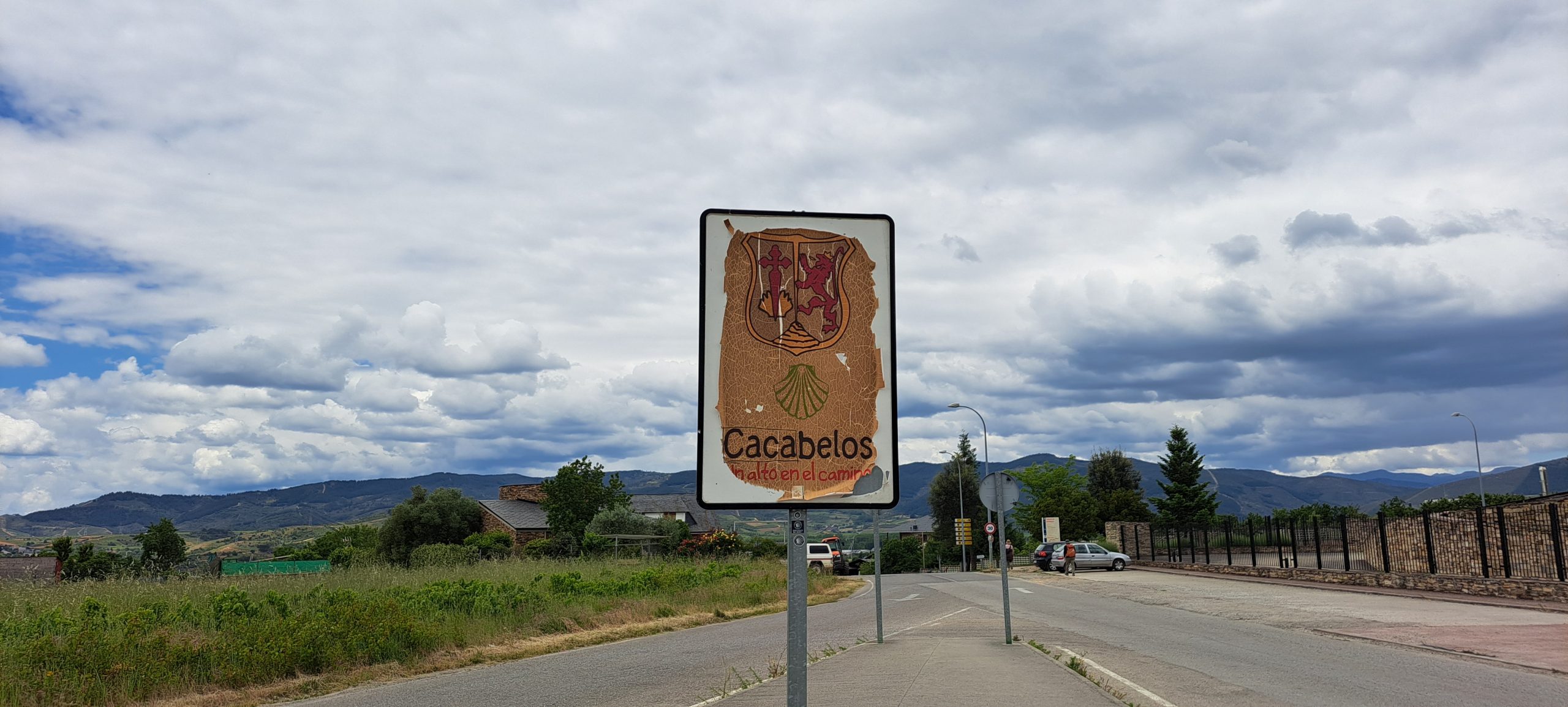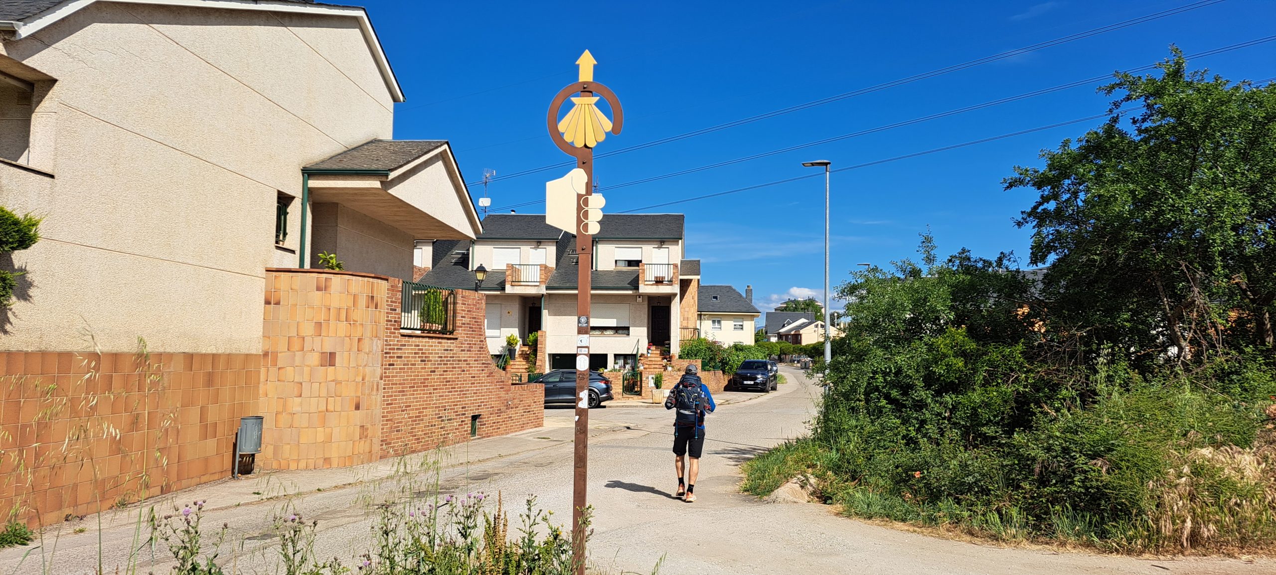 Dahinter ging der Weg steil bergauf. Oben angekommen, hatten wir noch einmal einen schönen Blick über Ponferada. An einer Treppe machten wir eine kurze Pause und die Beine von unseren Hosen ab. Es wird wieder sehr heiß heute. Ab dem nächsten Ort Columbrianos hatten wir schöne Wegweiser, einen Pilgerstab mit Muschel und Pfeil in Wegrichtung.