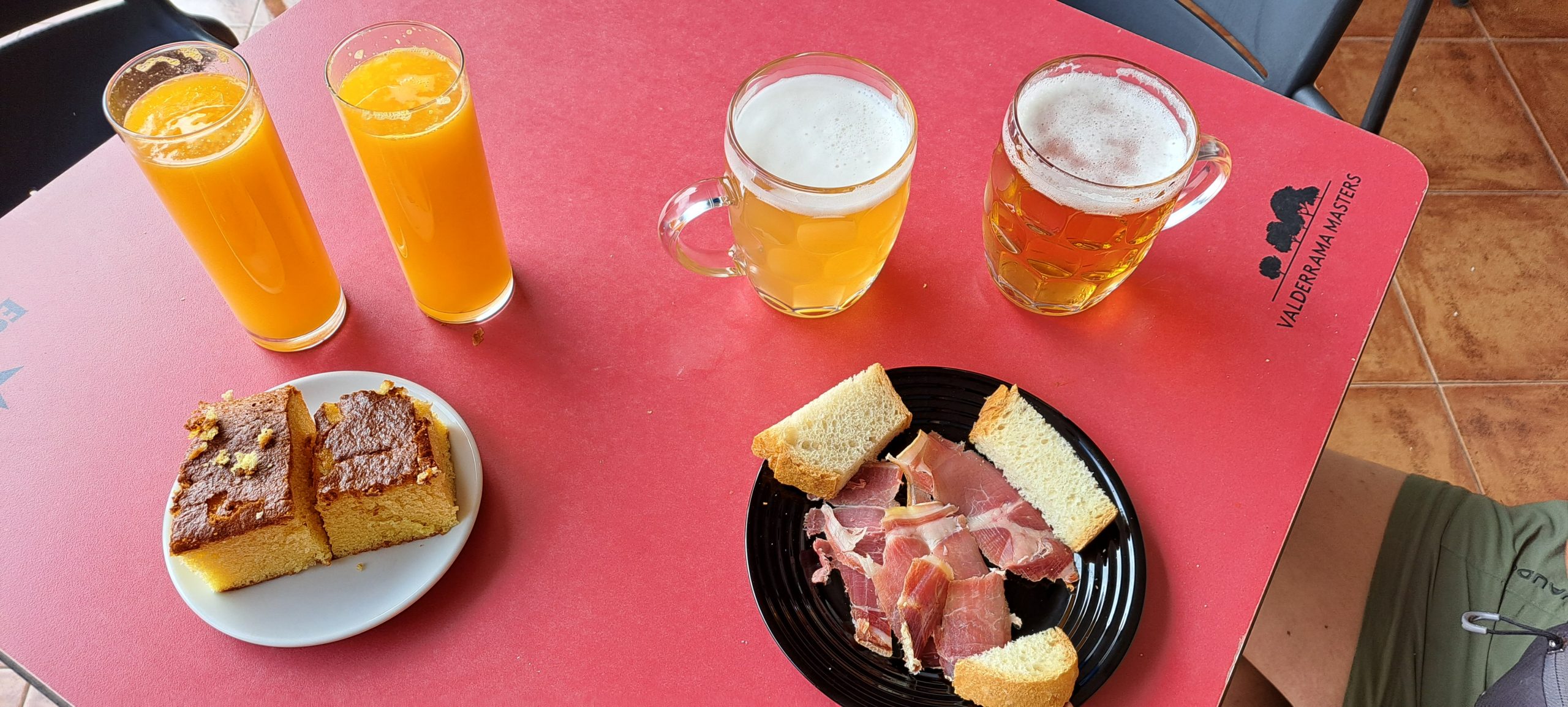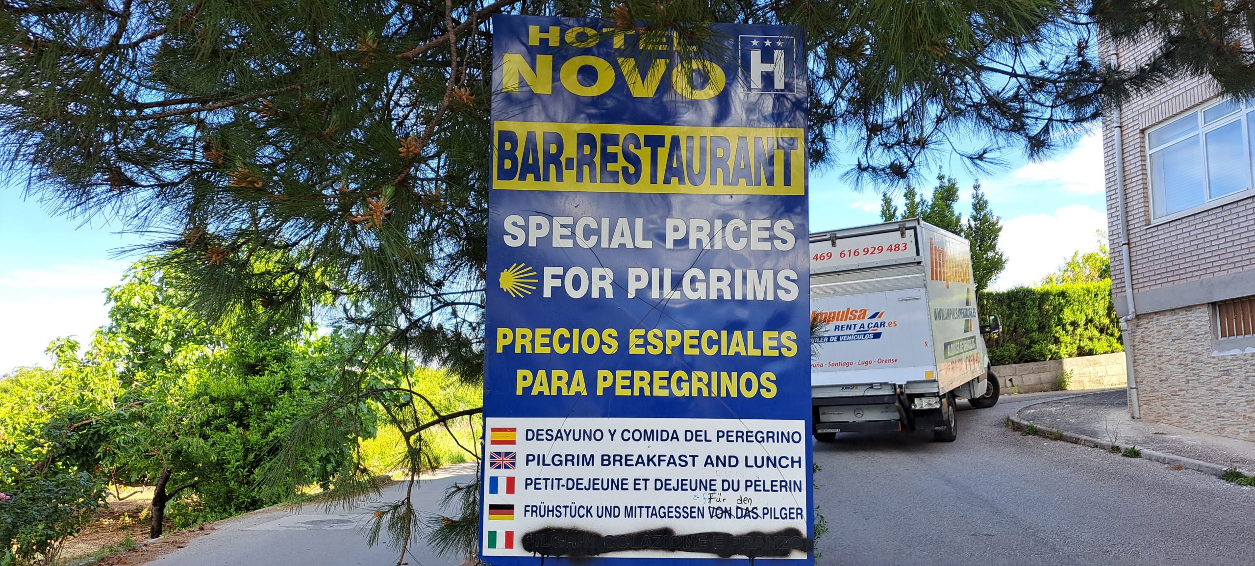 Einige hundert Meter kamen wir am Hotel Nova vorbei, hier wurde gebaut, aber es war noch ein Schild aufgestellt mit der deutschen Übersetzung: „Frühstück und Mittagessen von das Pilger“, sehr lustig. Wieder ging es nur auf Asphalt weiter. In der kleinen Bar „Bar Pedrin“ machten wir noch einmal eine Pause und bestellten jeder einen Orangensaft und bekamen jeder einen Kuchen dazu und ein Bier/Radler und nun bekamen wir ein Schinkenbrot dazu.