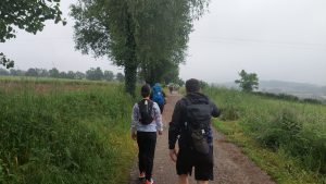 Dann liefen wir weiter. Gegen halb eins machten wir auf einer Bank eine Pause und aßen unser Baguette und die Banane und beobachteten den Pilgerstrom.