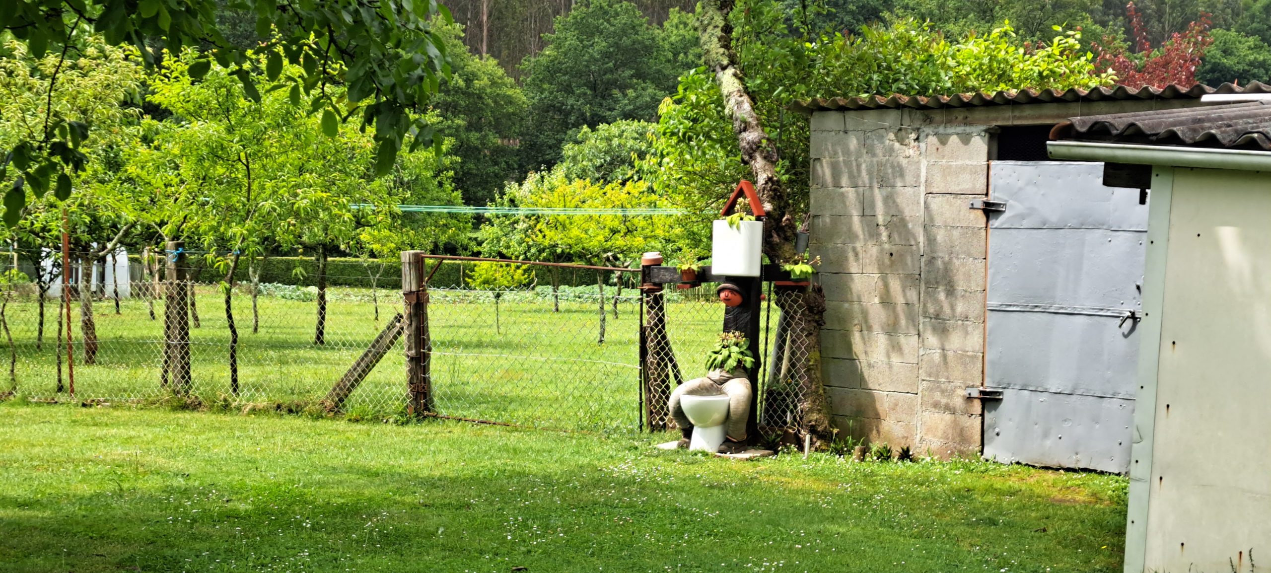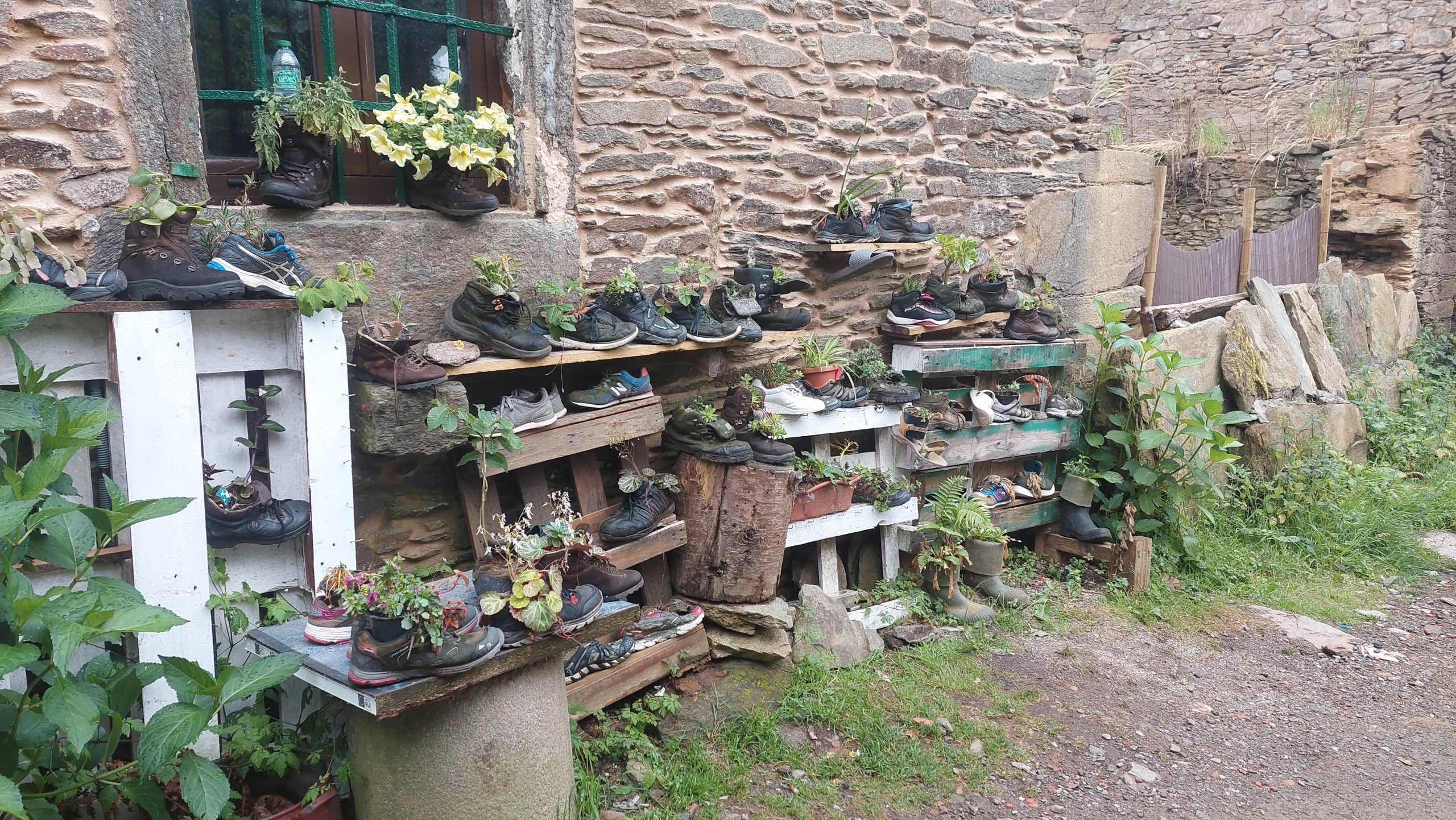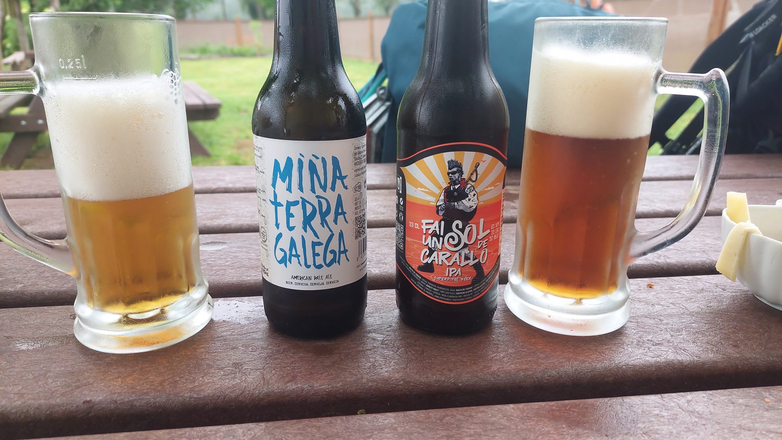 Das ist ein ganz anderes Pilgern, als vor Sarria. Das ist ein ganz anderer Menschenschlag, keiner nimmt Rücksicht, sie sind laut einfach fürchterlich. Man muss sich regelrecht durchdrängen, denn Platz machen sie keinen. In A Peroxa in der Bar A granxa de Tato wollten wir einen Kaffee trinken. Den gab es hier nicht, ein Bier konnten wir bekommen. Nico bestellte 2 Craftbeer. Wow waren die stark. Im schönen Garten tranken wir diese.