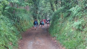 Was hier so vorbei zog, kann man gar nicht beschreiben. Nach einer Weile des Weitergehens hörten wir eine Klangschale und rochen Weihrauch. Ein Mann saß auf einem Stein und spielte auf seiner Klangschale. Er bot sogar Massagen an, aber im Freien und jeder kann zusehen. Nein Danke. Nach 1 Stunde kamen wir in O Pedrouzo an.