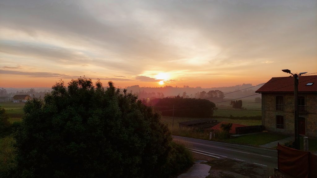Heute haben wir ausgeschlafen und sind erst kurz nach 8:00 Uhr losgegangen. Einen Kaffee haben wir von Luis noch bekommen. Er kam mit hinaus und zeigte uns noch einmal den Weg, er hat mit weißen Pfeilen den Weg markiert, der zum Camino führt, um nicht über Negreira zu gehen.