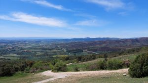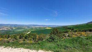 Wir wussten es gibt hier auch einen Stempel, doch der Polizist wollte uns zur Stadtinformation schicken, diese hatte aber noch geschlossen, so suchte er einen Kollegen und wir bekamen von ihm doch unseren Stempel der Stadt Pamplona. Wir schlenderten durch die Straßen von Pamplona durch einen schönen Park und an einer Schule vorbei. Die Schüler machten an der Straße Sportunterricht, Treppen schnell hinauf laufen auf Zeit. Noch ein paar Minuten und Pamplona lag hinter uns. An der Straße entlang liefen wir bis nach Cisur Menor. An einem Spielplatz gab es eine Banane, ein Google-Auto sahen wir auch. Wir waren zu weit entfernt um abgelichtet zu werden. Nun ging es auf Feldwegen entlang weiter Richtung Alto de Perdón. Nach einem ersten Anstieg kamen wir in Zariquiegui an und konnten uns in der Kirche einen Stempel holen. Gegenüber der Kirche war ein kleiner Laden, hier holten wir uns erst einmal ein Eis und genossen es im Schatten gegenüber. Nun ging es den steileren Teil des Berges hinauf. Es war schon sehr heiß und wir kamen nur langsam voran. Auf dem Alto de Perdón angekommen genossen wir den weiten Blick über die Landschaft.