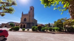 Naja, dann eben beim nächsten Mal. Ich war schon sehr traurig. Aber ich habe ein schönes Video von Jutta bekommen. Wir machten am Wegesrand eine Pause und genossen die Nüsse und unser Wasser, noch einmal zogen wir die Schuhe aus. Das brachte wieder Energie. Die Ameisen unter mir hatten wohl auch Hunger, ich sprang auf und schüttelte sie ab. Nun muss doch unser Ziel bald kommen, dachten wir. Doch erst kam noch Obanos. Wir gingen in die Kirche um uns etwas abzukühlen und wurden gleich von einem jungen Mann angesprochen, die hier missionierte, er fragte uns woher wir kamen und sagte wir seien Nachbarn. Er kam aus Polen und gab uns noch einen Stempel.