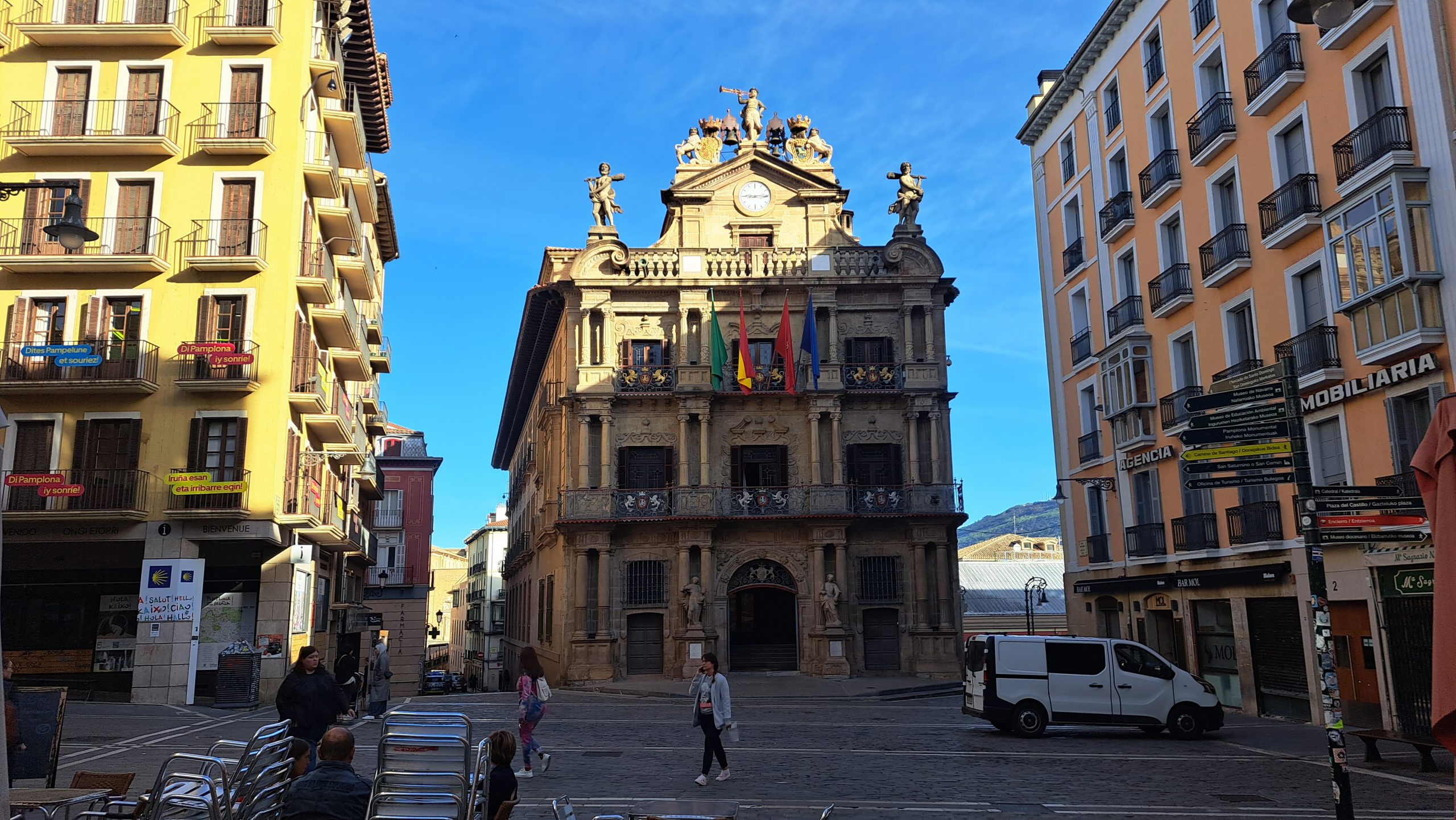 Heute konnten wir uns Zeit lassen, denn wir wollten vorher noch zur Post gehen, um ein Paket mit überflüssigen Sachen nach Hause zu schicken. Die Post machte erst 8:30 Uhr auf, 10 Minuten vorher standen wir bereits vor der Post in einer Warteschlange. Die Post öffnete pünktlich. Nun suchten wir uns einen Karton und verstauten die Sachen, die wir zurück senden wollten. Im Handy gab ich gleich den Text zum Übersetzen ein, was wir wollten mit der Adresse und Telefonnummer. Nun noch den Ausweis dazu legen und alles der netten Dame am Schalter übergeben. Das ganze kostete 30 €. Nach kurzer Zeit waren wir wieder draußen und nun konnten wir unseren Camino mit 3kg weniger Gepäck fortsetzen. Jetzt meldete sich noch der kleine Hunger. Wir fanden eine kleine Bar, als wir gefrühstückt hatten, befanden wir uns direkt gegenüber dem Rathaus.