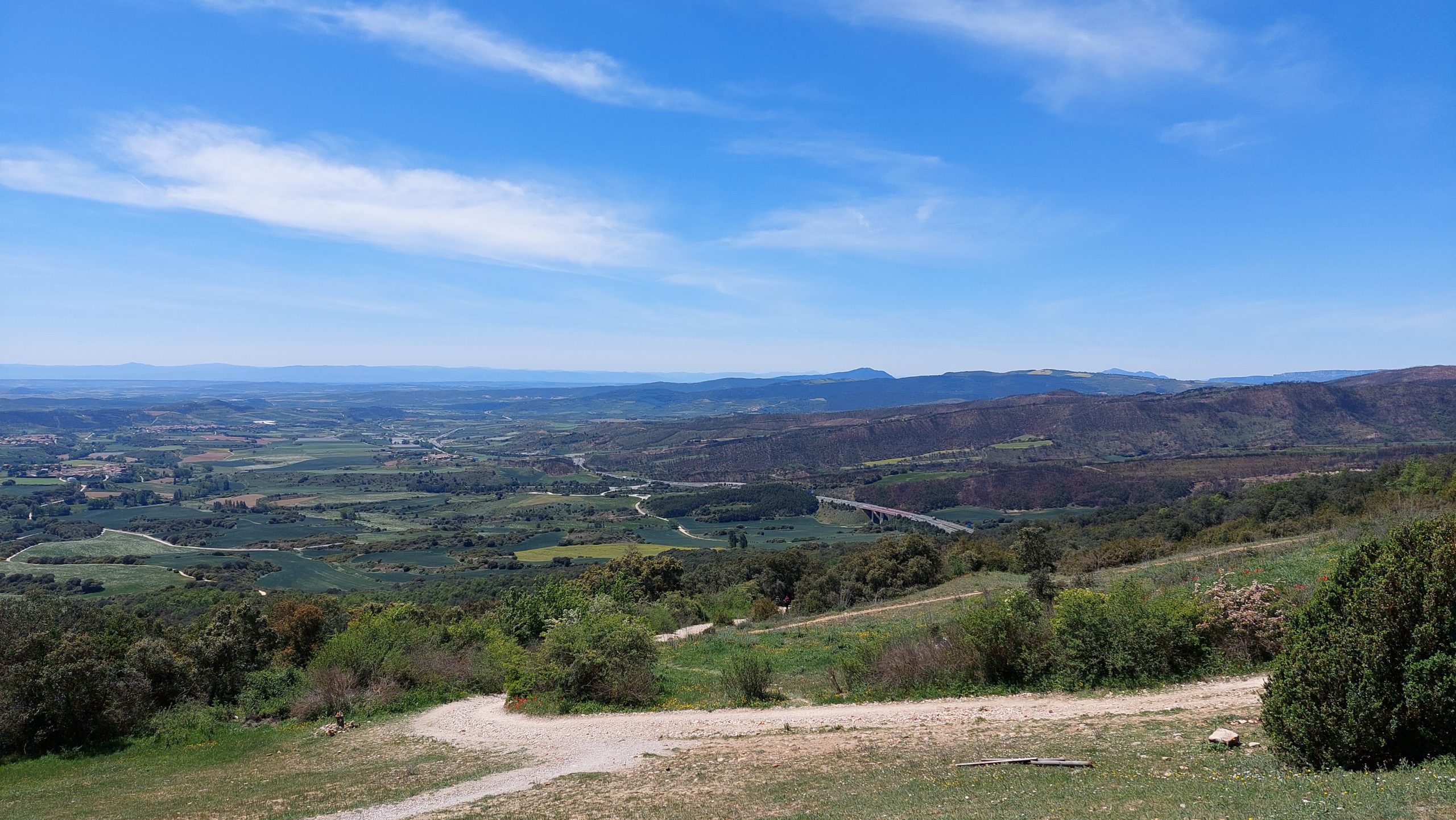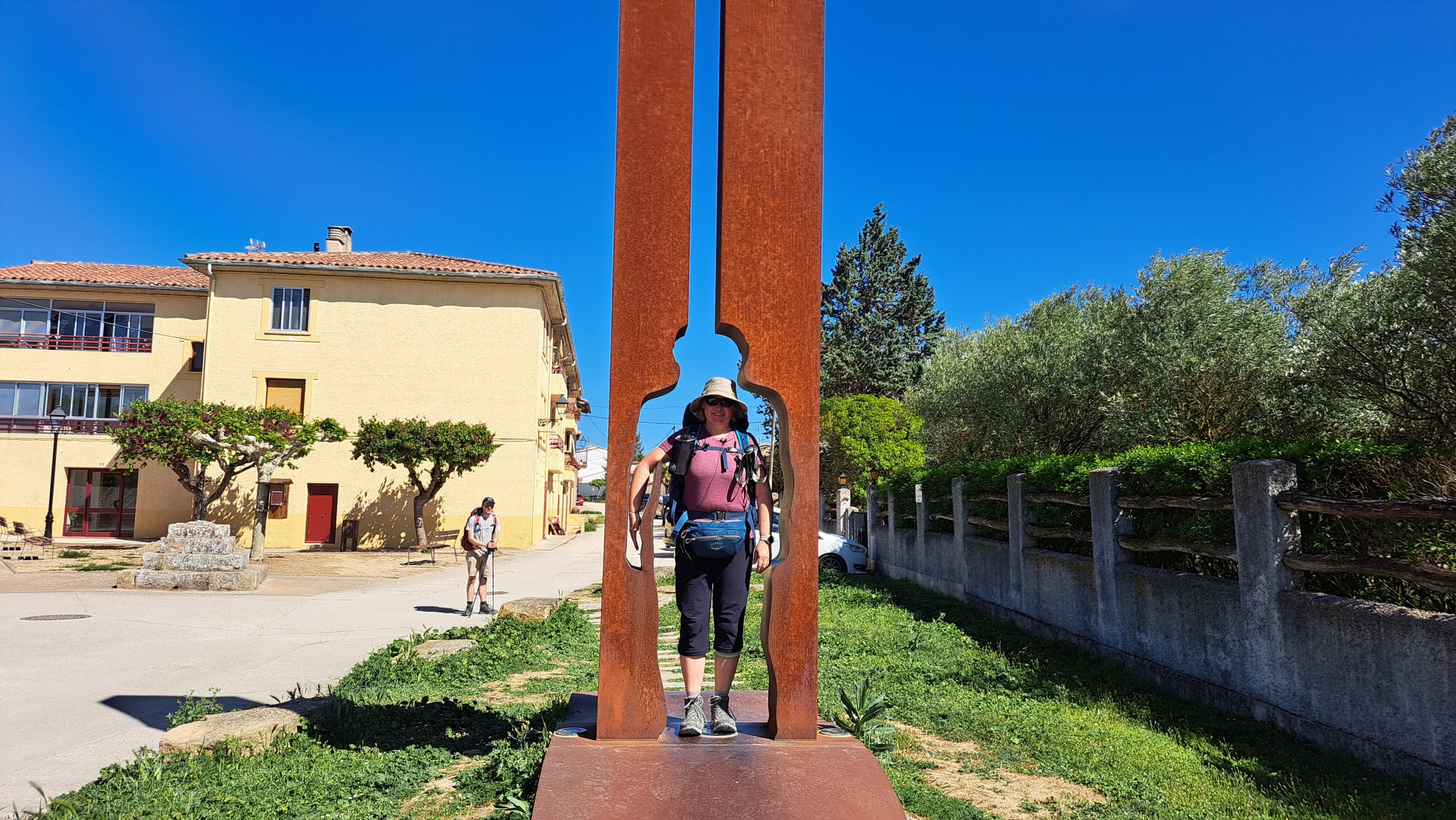 Wir wussten es gibt hier auch einen Stempel, doch der Polizist wollte uns zur Stadtinformation schicken, diese hatte aber noch geschlossen, so suchte er einen Kollegen und wir bekamen von ihm doch unseren Stempel der Stadt Pamplona. Wir schlenderten durch die Straßen von Pamplona durch einen schönen Park und an einer Schule vorbei. Die Schüler machten an der Straße Sportunterricht, Treppen schnell hinauf laufen auf Zeit. Noch ein paar Minuten und Pamplona lag hinter uns. An der Straße entlang liefen wir bis nach Cisur Menor. An einem Spielplatz gab es eine Banane, ein Google-Auto sahen wir auch. Wir waren zu weit entfernt um abgelichtet zu werden. Nun ging es auf Feldwegen entlang weiter Richtung Alto de Perdón. Nach einem ersten Anstieg kamen wir in Zariquiegui an und konnten uns in der Kirche einen Stempel holen. Gegenüber der Kirche war ein kleiner Laden, hier holten wir uns erst einmal ein Eis und genossen es im Schatten gegenüber. Nun ging es den steileren Teil des Berges hinauf. Es war schon sehr heiß und wir kamen nur langsam voran. Auf dem Alto de Perdón angekommen genossen wir den weiten Blick über die Landschaft.