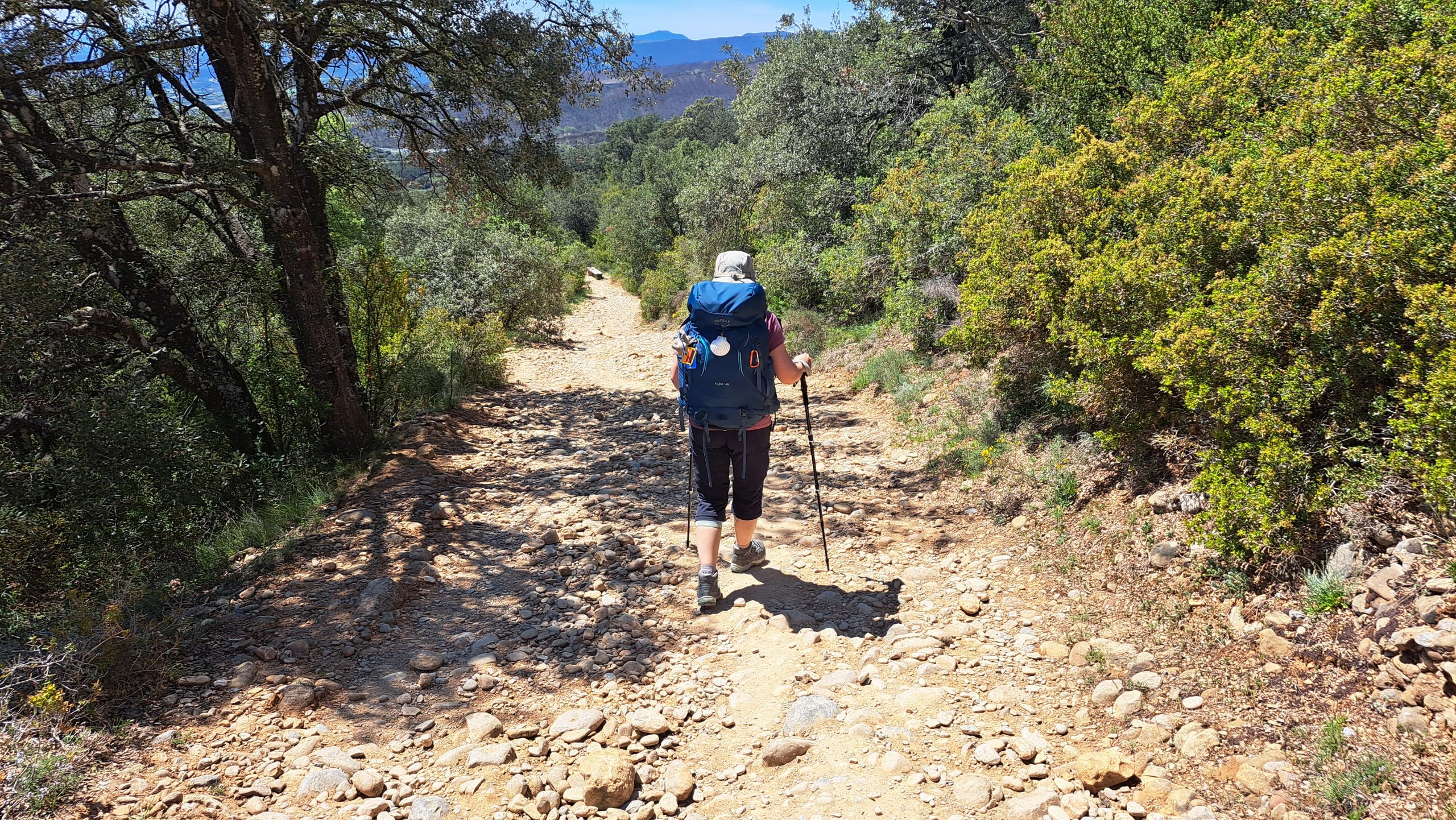 Naja, dann eben beim nächsten Mal. Ich war schon sehr traurig. Aber ich habe ein schönes Video von Jutta bekommen. Wir machten am Wegesrand eine Pause und genossen die Nüsse und unser Wasser, noch einmal zogen wir die Schuhe aus. Das brachte wieder Energie. Die Ameisen unter mir hatten wohl auch Hunger, ich sprang auf und schüttelte sie ab. Nun muss doch unser Ziel bald kommen, dachten wir. Doch erst kam noch Obanos. Wir gingen in die Kirche um uns etwas abzukühlen und wurden gleich von einem jungen Mann angesprochen, die hier missionierte, er fragte uns woher wir kamen und sagte wir seien Nachbarn. Er kam aus Polen und gab uns noch einen Stempel.