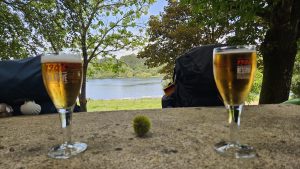 Nach einer Weile hörten wir Musik und wunderten uns, wo diese her kam. Auf einer Verkehrsinsel war auf dem Berg eine Bar. Die Bar „Refúgio dos Manos“ war perfekt für eine Pause.