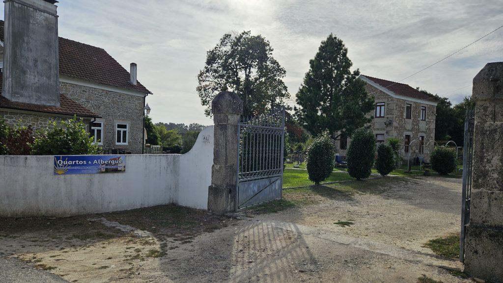 Und dann sind wir in unsere Herberge gegangen. Leider gab es heute kein gemeinsames Abendessen, so haben wir unser Zimmer bezogen und sind nach Valença gegangen, um etwas zum Abendessen zu suchen. Portugal hat eine andere Zeitzone als Spanien. Meine Uhr zeigt mir bereits die spanische Zeit (+1h). Wir waren also zu früh beim Abendessen. In der Bar „QUIVI snack bar“ bekamen wir für  10 € pro Person ein 3 Gänge Menü. Als Vorspeise gab es Salat, der Hauptgang war 1/2 Hähnchen mit Pommes und als Nachtisch ein karamellisiertes Törtchen. Hier in der Bar war auch eine Uhr und nun viel mir auf, dass wir zu früh beim Essen waren.