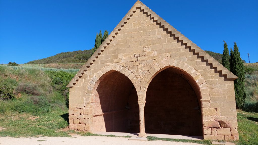 Hier wird jeden Tag 100 Liter Rotwein zur Verfรผgung gestellt, die man kostenlos trinken kann. Aus einem zweiten Zapfhahn bekam man Wasser. Wir probierten den Wein, dieser war sehr trocken. Wir machten ein paar Fotos und gingen dann weiter, andere Pilger wollten auch von dem Wein probieren. Etwas angeschwiemelt liefen wir, ohne Asphalt unter den Fรผรen immer schรถn flach weiter. Wir kamen zu einer kleinen Steigung, die ich mit kleinen Schritten erklomm, damit die meine Blasen nicht so schmerzten. Der Weg fรผhrte an einem Brunnen vorbei. Neben dem Brunnen, war ein Rastplatz.
