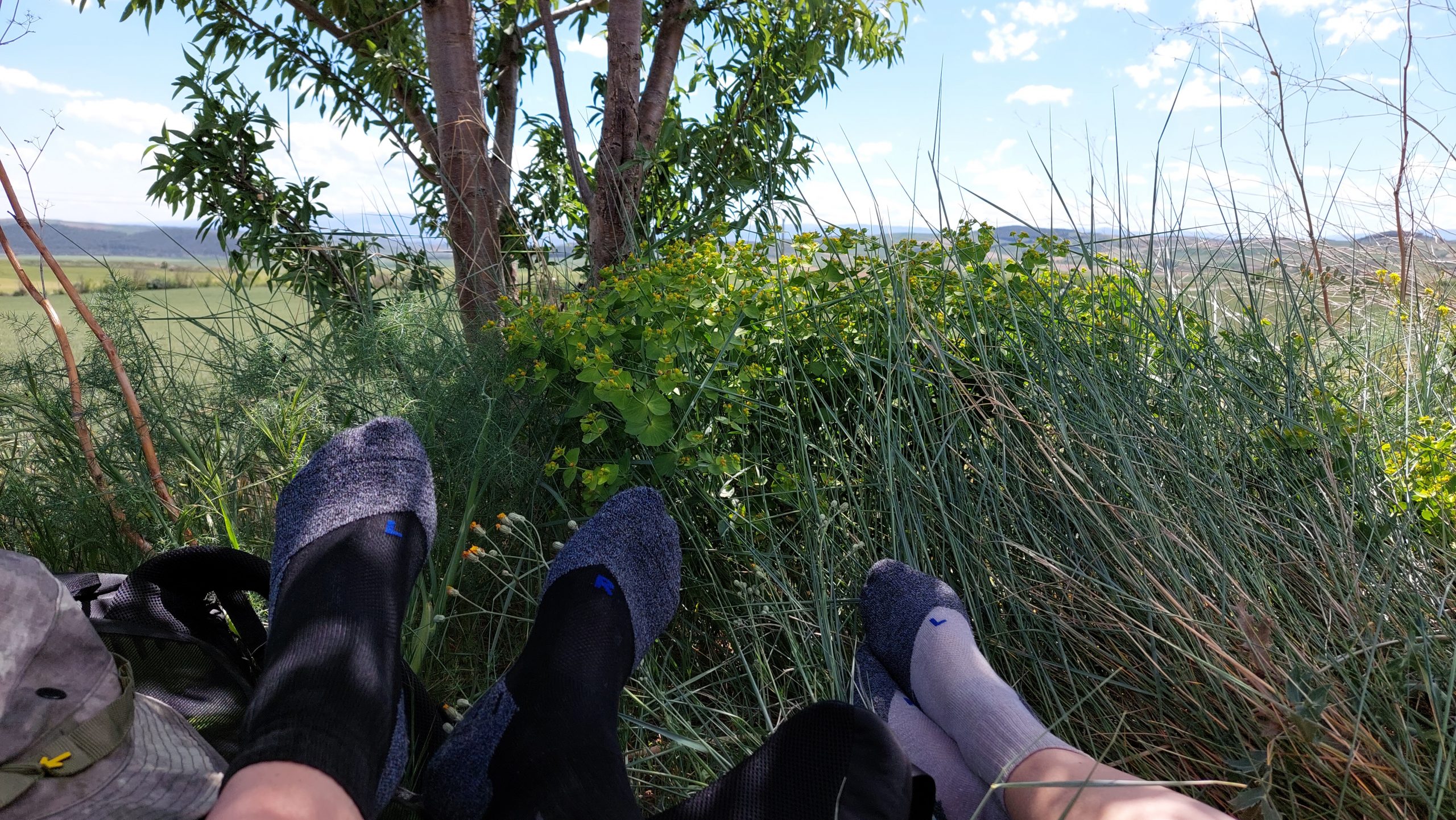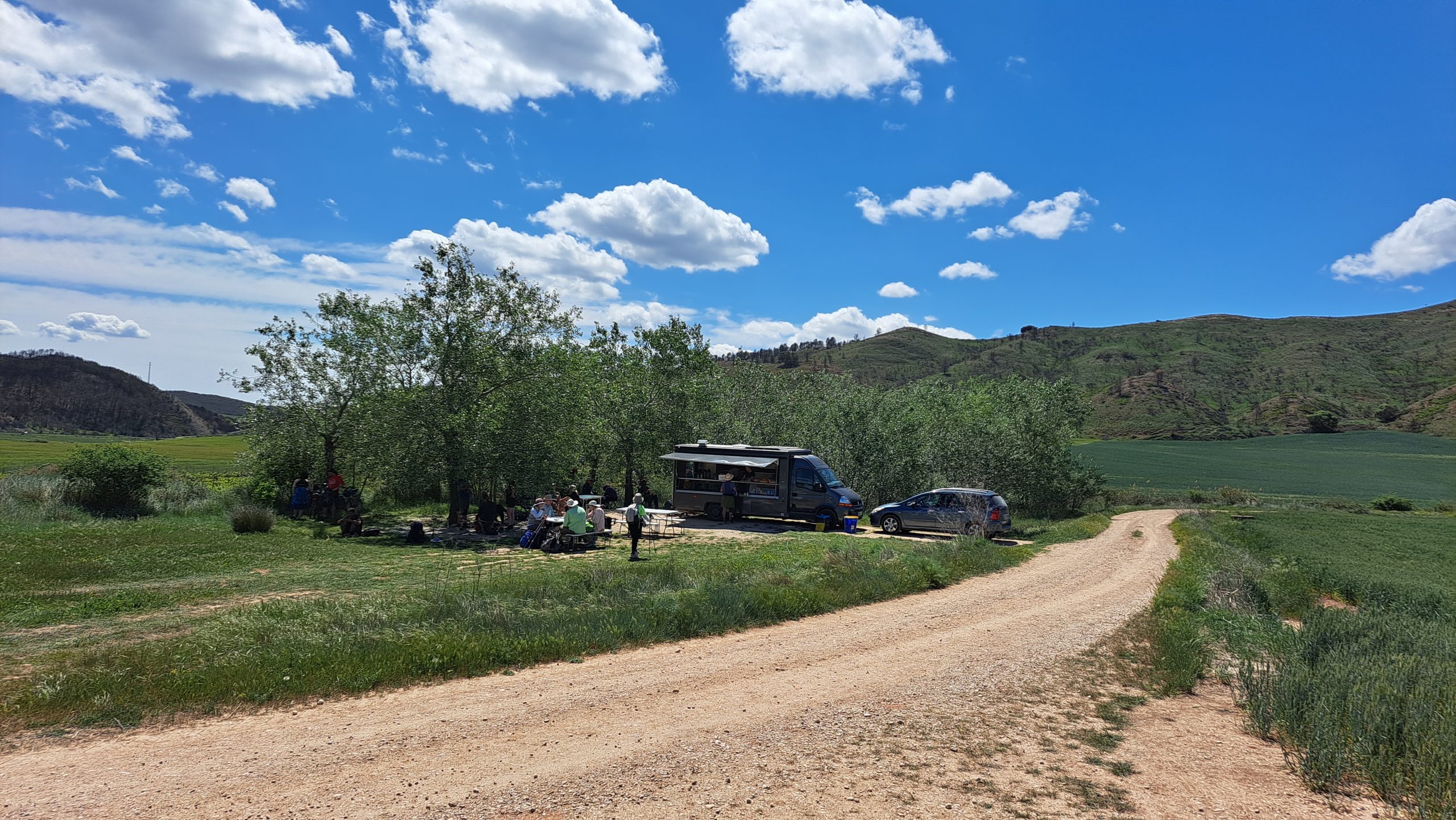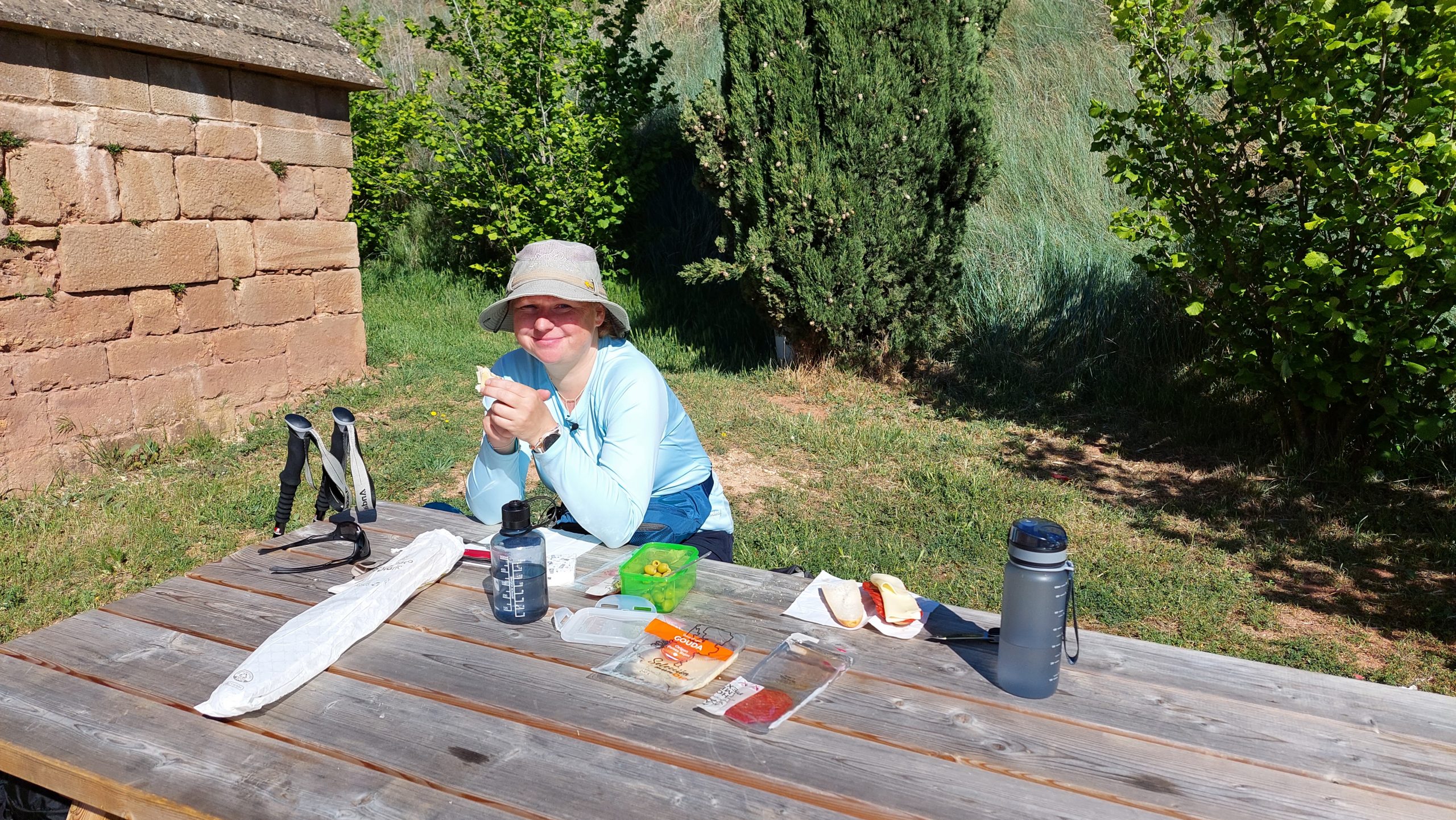 Hier machten wir eine Pause und packten unser mitgebrachtes Baguette, Chorizo, Käse und Oliven aus. Wir machten ein ausgiebiges Frühstücks-Picknick. Gestärkt und die Aussicht genossen liefen wir nach Villamayor de Monjardín. Leider war die Kirche verschlossen. Da wir bereits eine Pause gemacht hatten, hielten wir in der Bar nicht an und gingen weiter. Der Weg führte nun auf Feldwegen weiter, es tat den Füßen sehr gut. Es lief sich sehr gut, inzwischen ist es sehr warm geworden. Wir kamen an einem Food Truck vorbei und machten eine Pause.