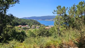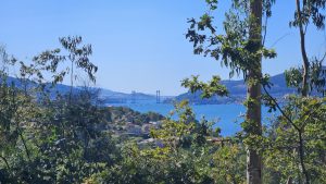 Leider kommt es auf dem Bild nicht so gut rรผber, wie steil es nach oben geht. Aber was uns entschรคdigte war der Blick auf den Rรญa de Vigo mit der Kettenbrรผckeย Ponte de Rande.
