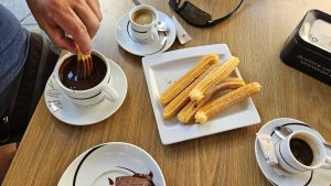 Wir fanden ein schรถnes Cafรฉ in der FuรŸgรคngerzone und bestellten und einen Cafรฉ con leche und Churros con Chocotale. Von hier aus konnten wir gut Leute beobachten.