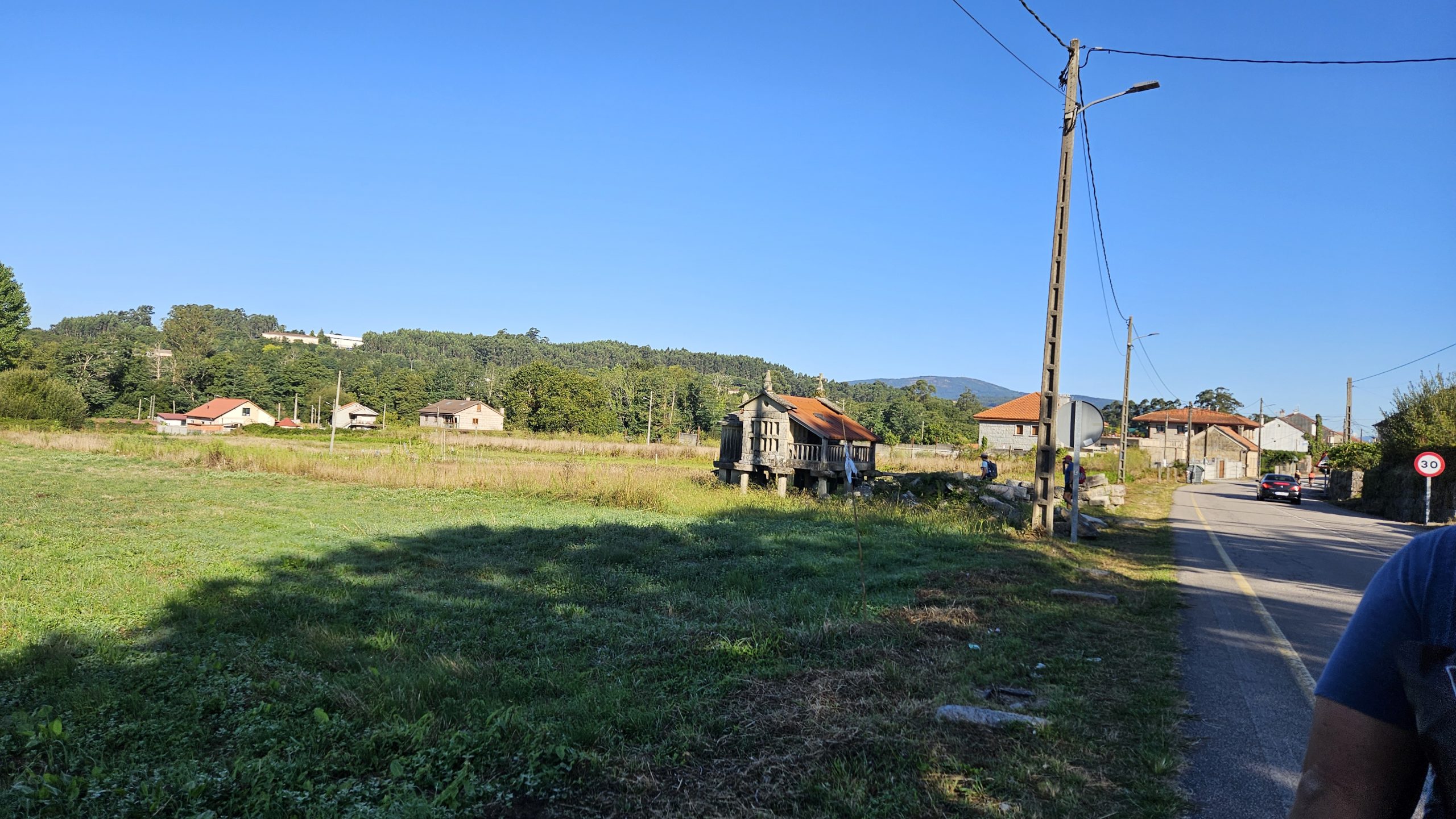 Wir liefen in O Casal do Rรญo die StraรŸe entlang und kamen an einem Pilgerkreuz vorbei. Hinter der Mauer war ein kleiner Park mit Rastplatz. Wir setzten uns unter die Bรคume und genossen unser Frรผhstรผck.